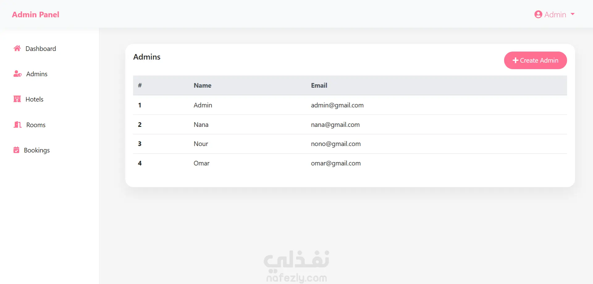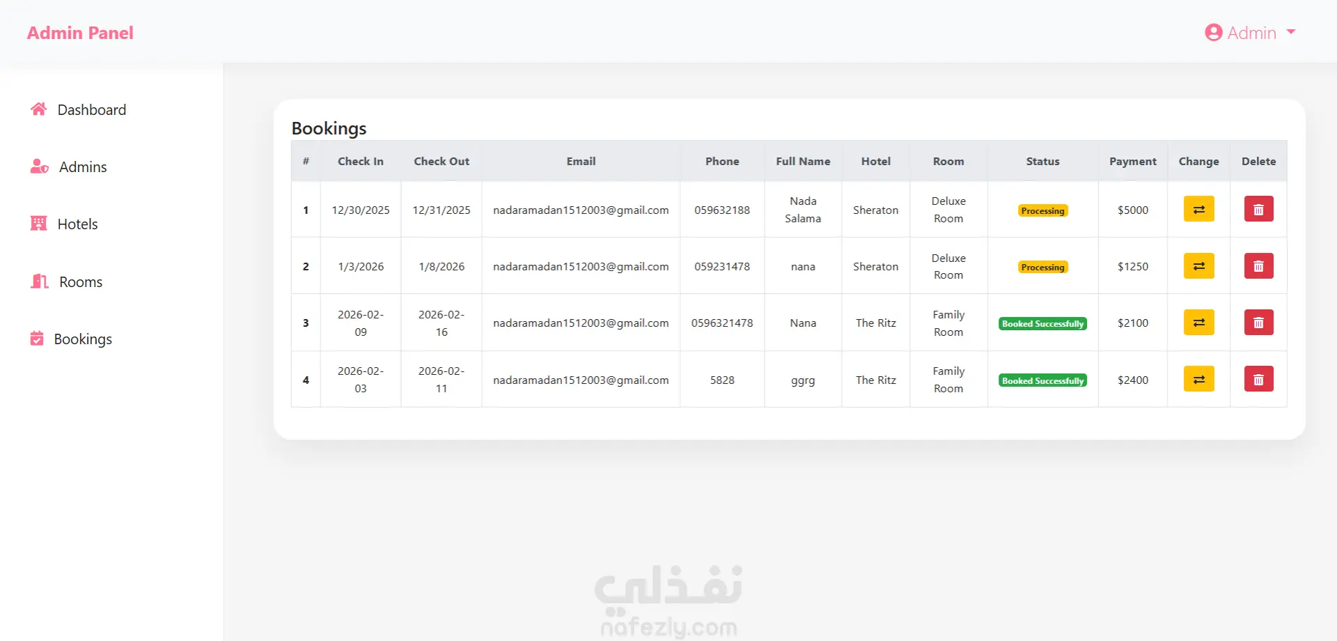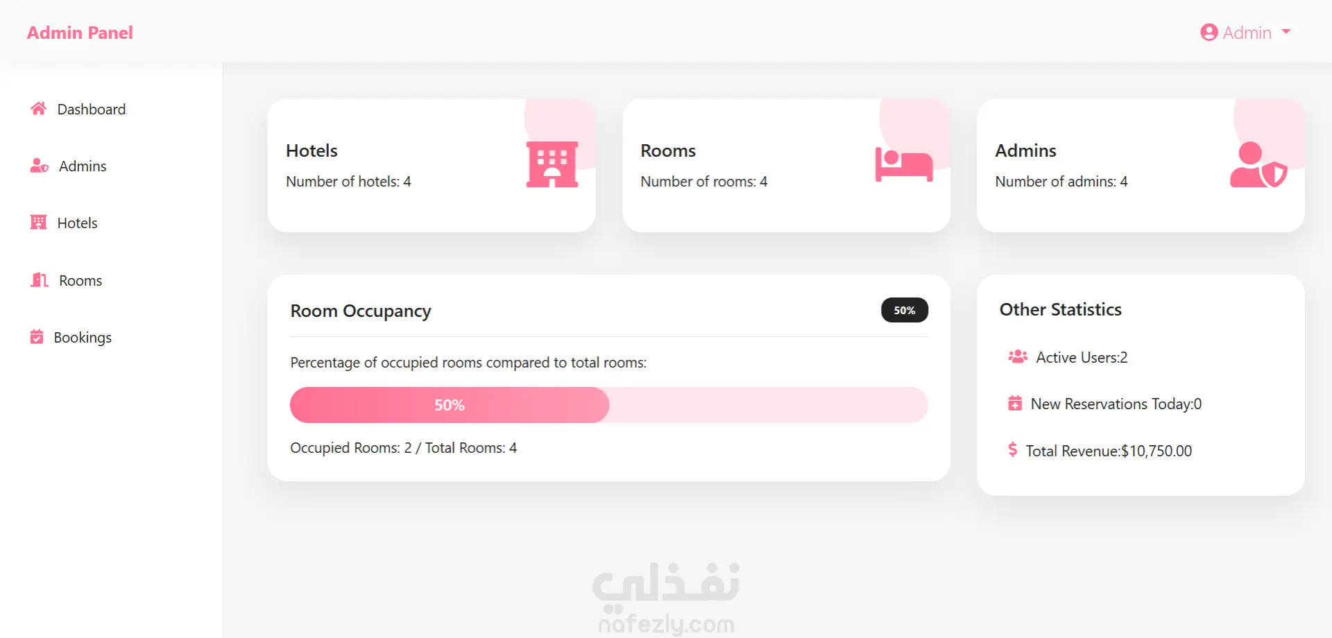 نظام إدارة فنادق حديث مبنيّ باستخدام Laravel، يتميز بلوحة تحكم إدارية متجاوبة تتيح لك إدارة الفنادق والغرف والحجوزات، والتعامل مع المستخدمين الإداريين، وتحديث حالات الحجوزات. يتضمن النظام عمليات CRUD للفنادق والغرف مع الصور والتفاصيل، ونظام مصادقة آمن، وواجهة مستخدم سلسة وسهلة الاستخدام، مما يجعله مثاليًا لمشاريع حجز الفنادق، ولوحات التحكم الإدارية، أو حلول إدارة الفنادق المخصصة.