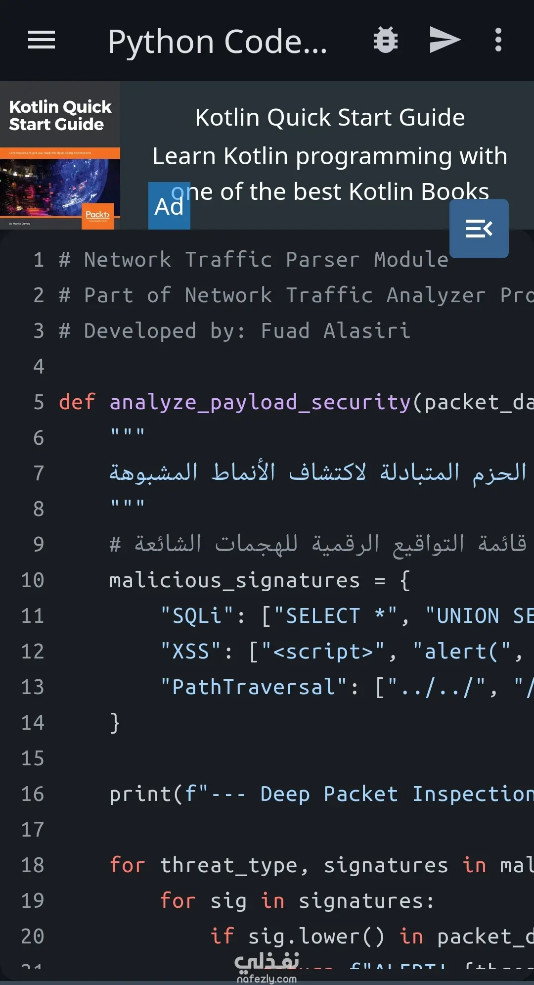 لقد قمت ببناء أداة متقدمة بلغة Python مخصصة لالتقاط وتحليل حركة مرور الشبكة المحلية (Network Traffic). تهدف الأداة إلى تعزيز الرقابة الأمنية واكتشاف أي نشاط غير طبيعي قد يشير إلى محاولة اختراق أو تسريب بيانات. الميزات التقنية التي نفذتها في الأداة: منطق فحص الحزم (Packet Sniffing): تنفيذ خوارزميات لالتقاط حزم البيانات المعتمدة على بروتوكولات TCP و UDP. تحليل الأنماط المشبوهة: القدرة على تمييز حركة المرور الشرعية عن الأنماط العدوانية (Anomalous Activities). نظام تسجيل الأحداث (Logging System): أتمتة عملية تسجيل كافة الأنشطة في سجلات تقنية (Logs) لتسهيل عملية التدقيق الأمني (Security Auditing). تحسين الكفاءة: تم تحسين الكود ليعمل بأقل استهلاك لموارد النظام مع ضمان دقة البيانات الملتقطة. تم تطوير هذه الأداة لخدمة مسؤولي الأنظمة في مراقبة سلامة الشبكات وضمان بيئة عمل رقمية آمنة.