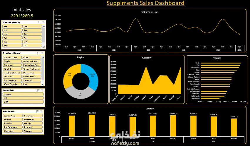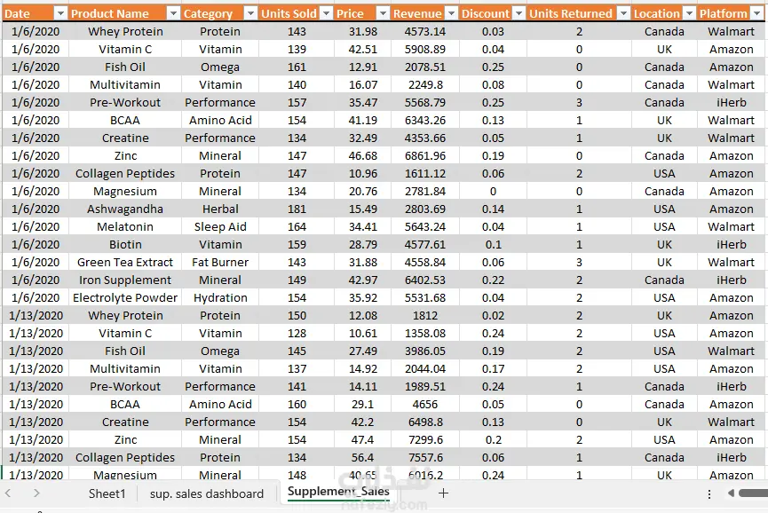 قمت بتصميم لوحة تحكم تفاعلية باستخدام برنامج Excel لتحليل بيانات مبيعات المكملات الغذائية، حيث شمل العمل تجهيز وتنظيم البيانات، وحساب مؤشرات الأداء الرئيسية، وعرض الاتجاهات والنتائج بشكل بصري واضح يساعد على فهم الأداء ودعم اتخاذ القرار.