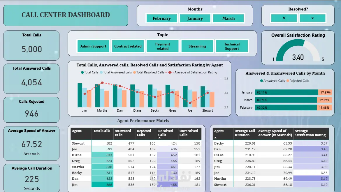 مشروع لتحليل بيانات خدمة العملاء باستخدام Power BI بهدف تقييم أداء الموظفين ومستوى رضا العملاء من خلال لوحات تفاعلية.