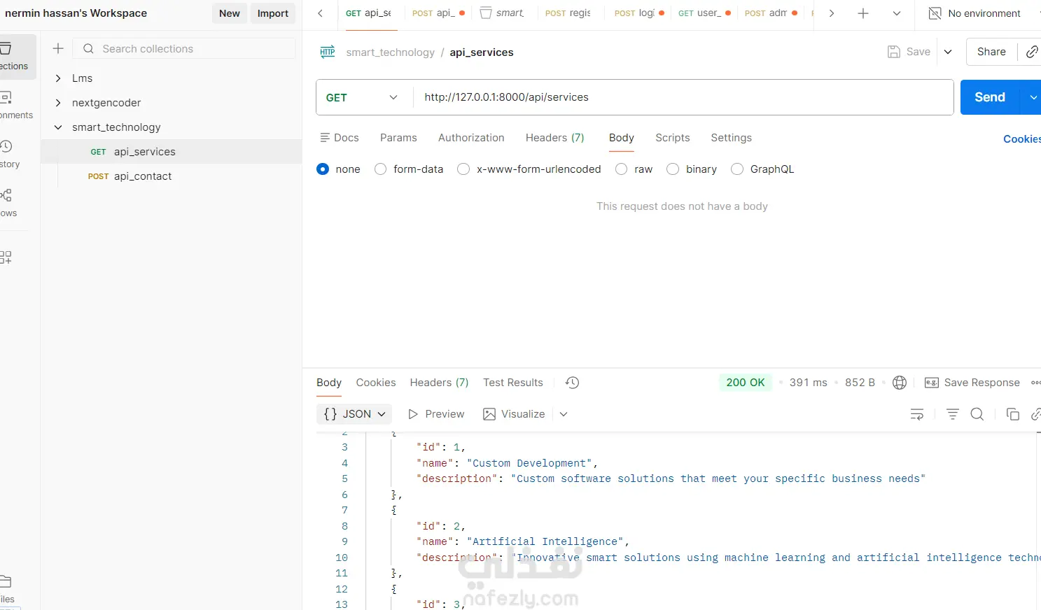 قمت بتطوير وربط الـ API الخاصة بموقع شركة software services مبني باستخدام React، حيث عملت على إنشاء نقاط النهاية (Endpoints)، معالجة البيانات، والتحقق من المدخلات، وضمان تكامل الواجهة مع النظام الخلفي بكفاءة. تم تنفيذ المشروع باستخدام Laravel وMySQL مع الالتزام بهيكلية MVC وأفضل الممارسات في تطوير الـ Backend
