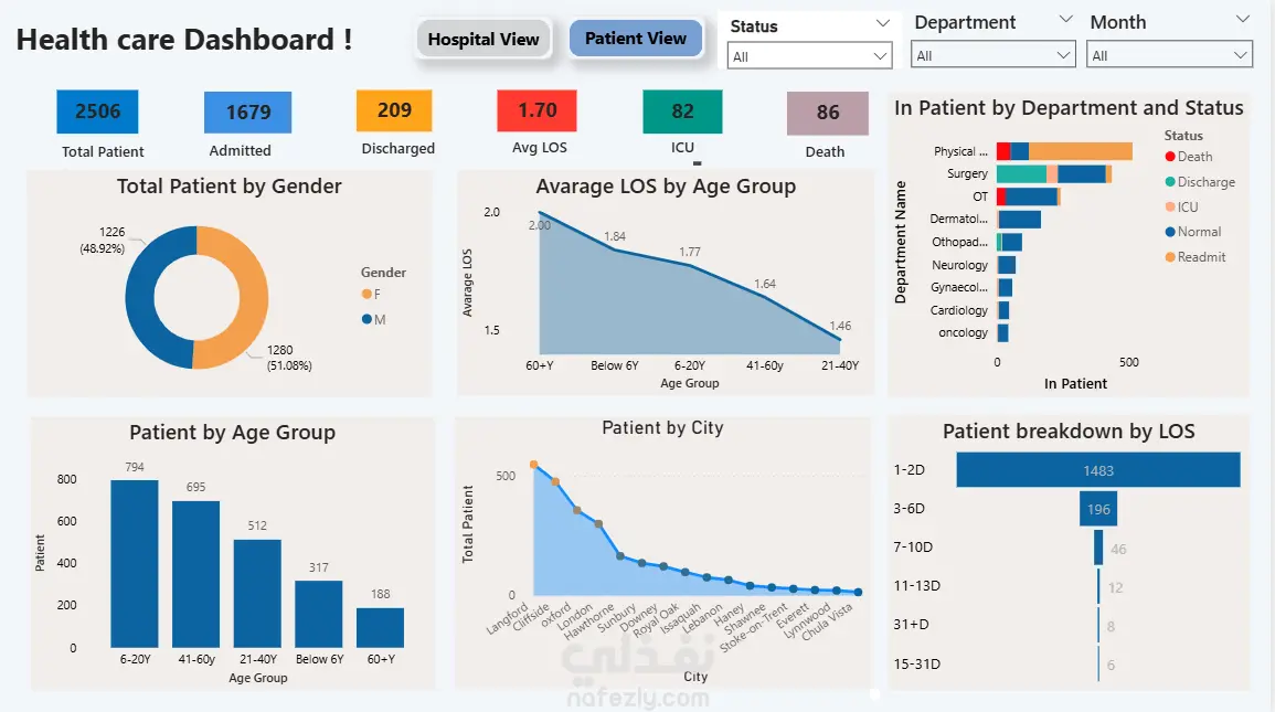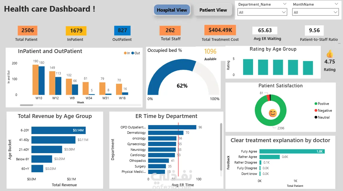 مشروع لتحليل بيانات المستشفيات والأطباء والمرضى باستخدام Power BI لاستخراج مؤشرات تحسين الأداء والخدمات الطبية.