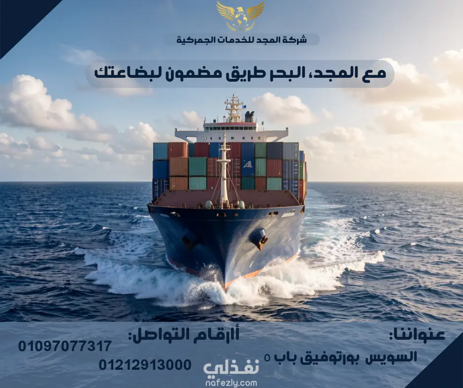 الصورة تُعبّر عن خدمات الشحن البحري والتخليص الجمركي، حيث تظهر سفينة شحن ضخمة محمّلة بالحاويات تسير في عرض البحر، ما يرمز إلى الأمان، القوة، والالتزام في نقل البضائع. التصميم يعكس الاحترافية والثقة، ويؤكد قدرة الشركة على نقل الشحنات بكفاءة عالية وضمان وصولها بأمان.