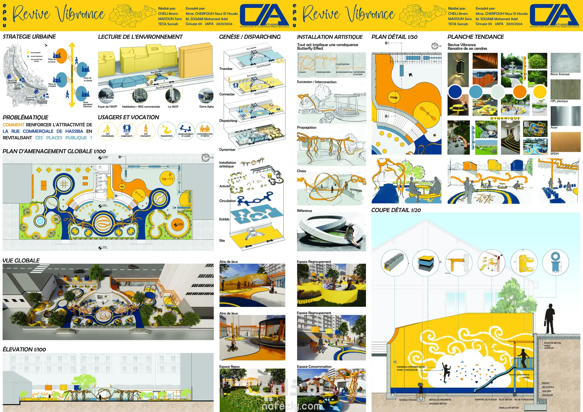 تصميم مكان عام (ساحة عامة) يقع في شارع حسيبة بن بوعلي التجاري، وسط الجزائر العاصمة، الجزائر. Design of a public square situated on Rue Hassiba Ben Bouali, a bustling commercial street in central Algiers, Algeria.