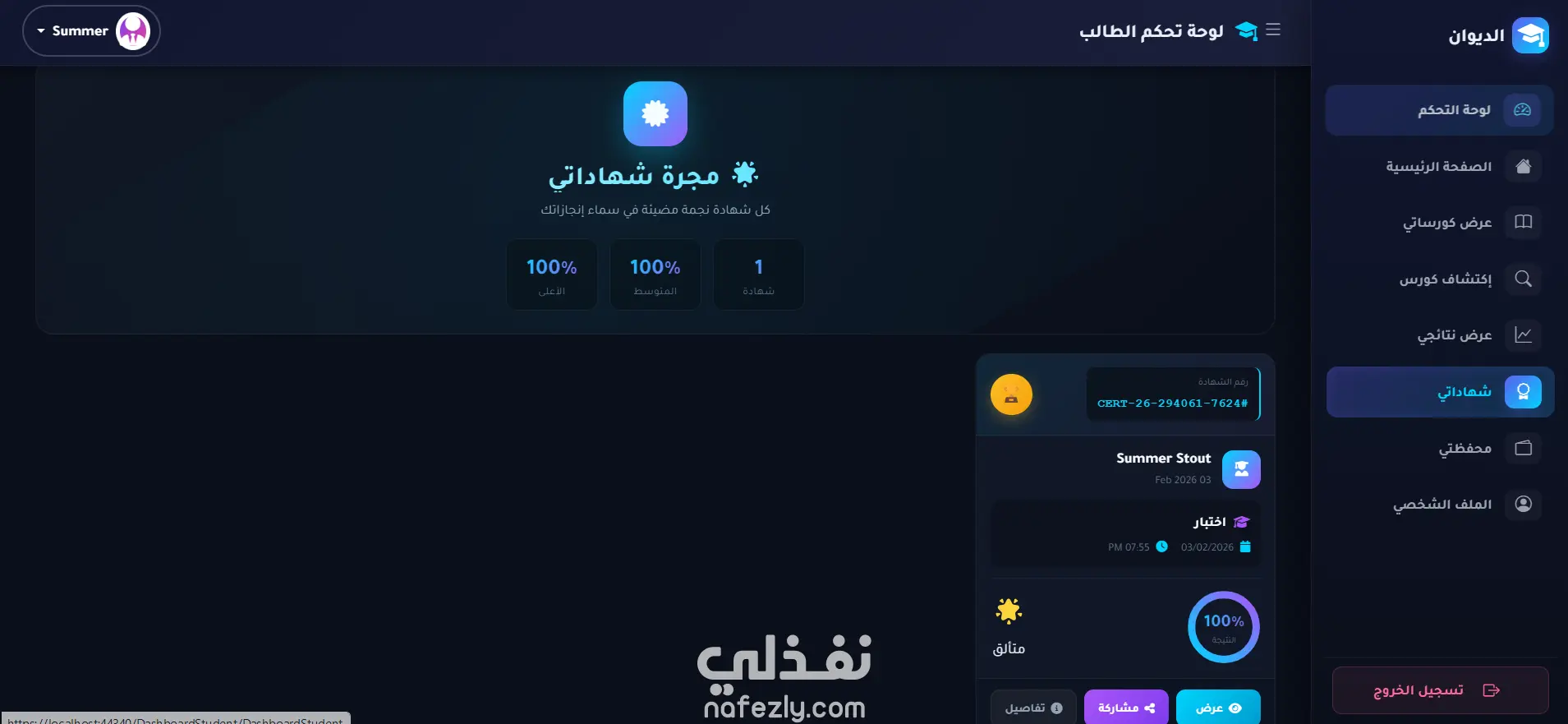 تم تنفيذ استضافة وحماية آمنة للفيديوهات باستخدام Bunny.net، بالإضافة إلى الامتحانات الأونلاين، والاختبارات القصيرة (Quizzes)، وإنشاء الشهادات تلقائيًا، مع استخدام Cloudinary لتخزين وإدارة الوسائط سحابيًا.