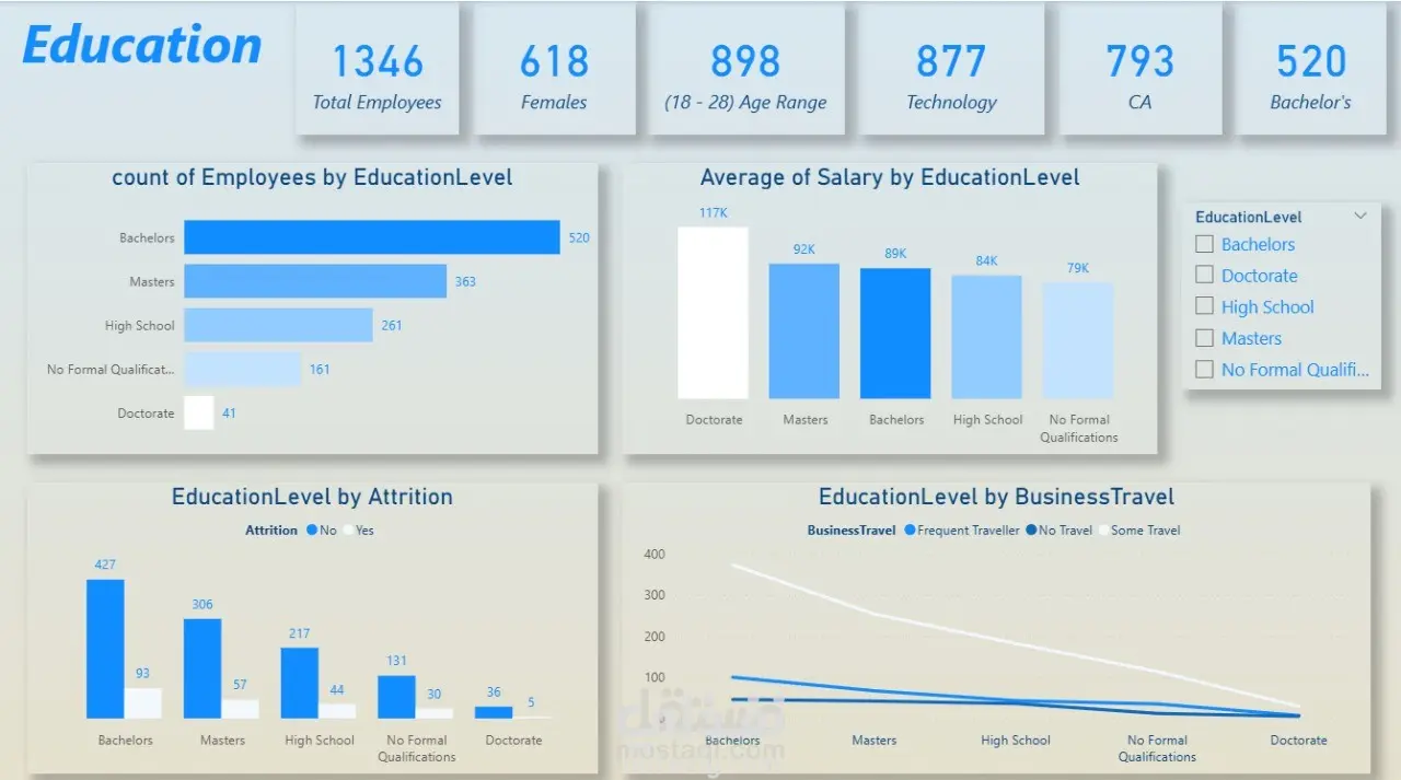 تحليل توزيع الموظفين حسب المستوى التعليمي، ومقارنة متوسط الرواتب بين مستويات التعليم المختلفة، بالإضافة إلى دراسة العلاقة بين التعليم ومعدل ترك العمل (Attrition).