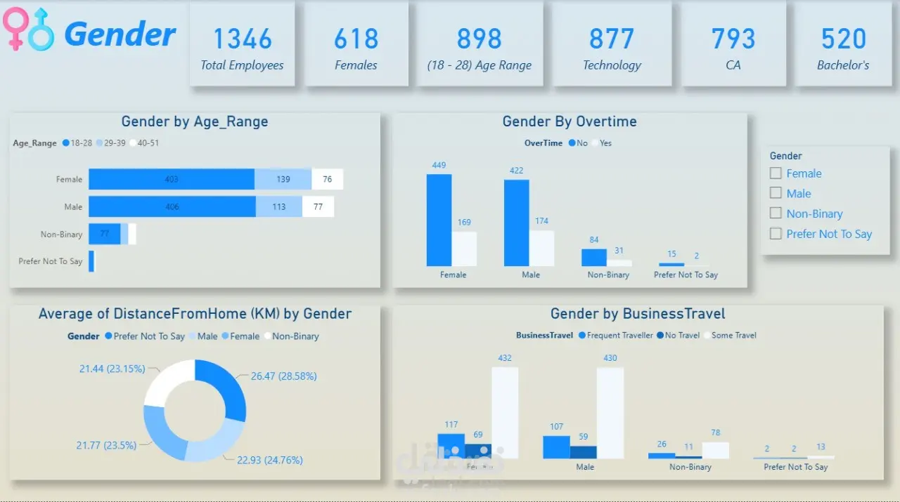 تحليل التوزيع بين الذكور والإناث والفئات الأخرى حسب الفئة العمرية، والسفر الوظيفي، والعمل الإضافي (Overtime)، بجانب دراسة متوسط المسافة من المنزل لكل فئة.