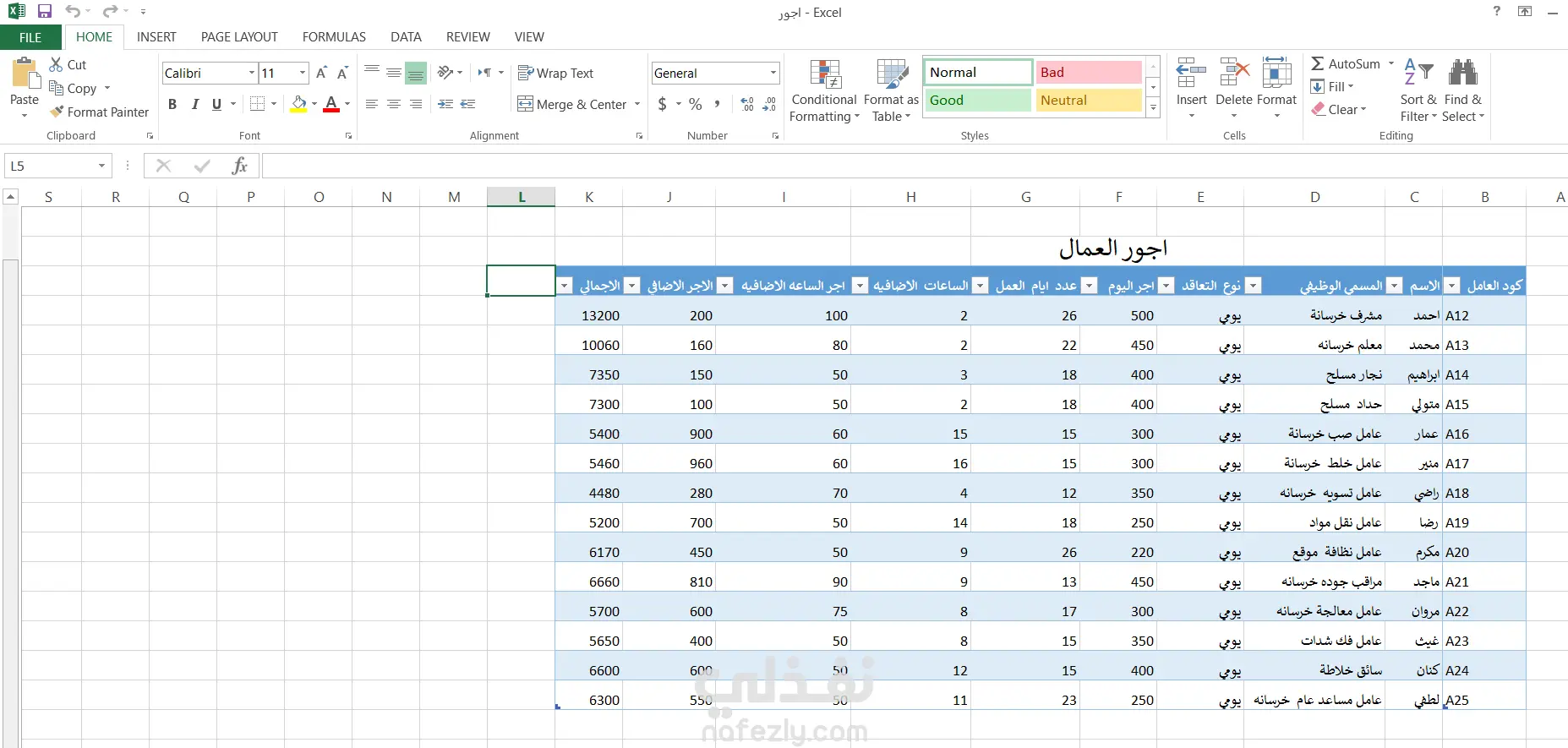 شيت اكسيل لحساب اجور العمال اليومية و تنظيم بياناتهم و عدد ايام العمل و الاجمال الشهرى