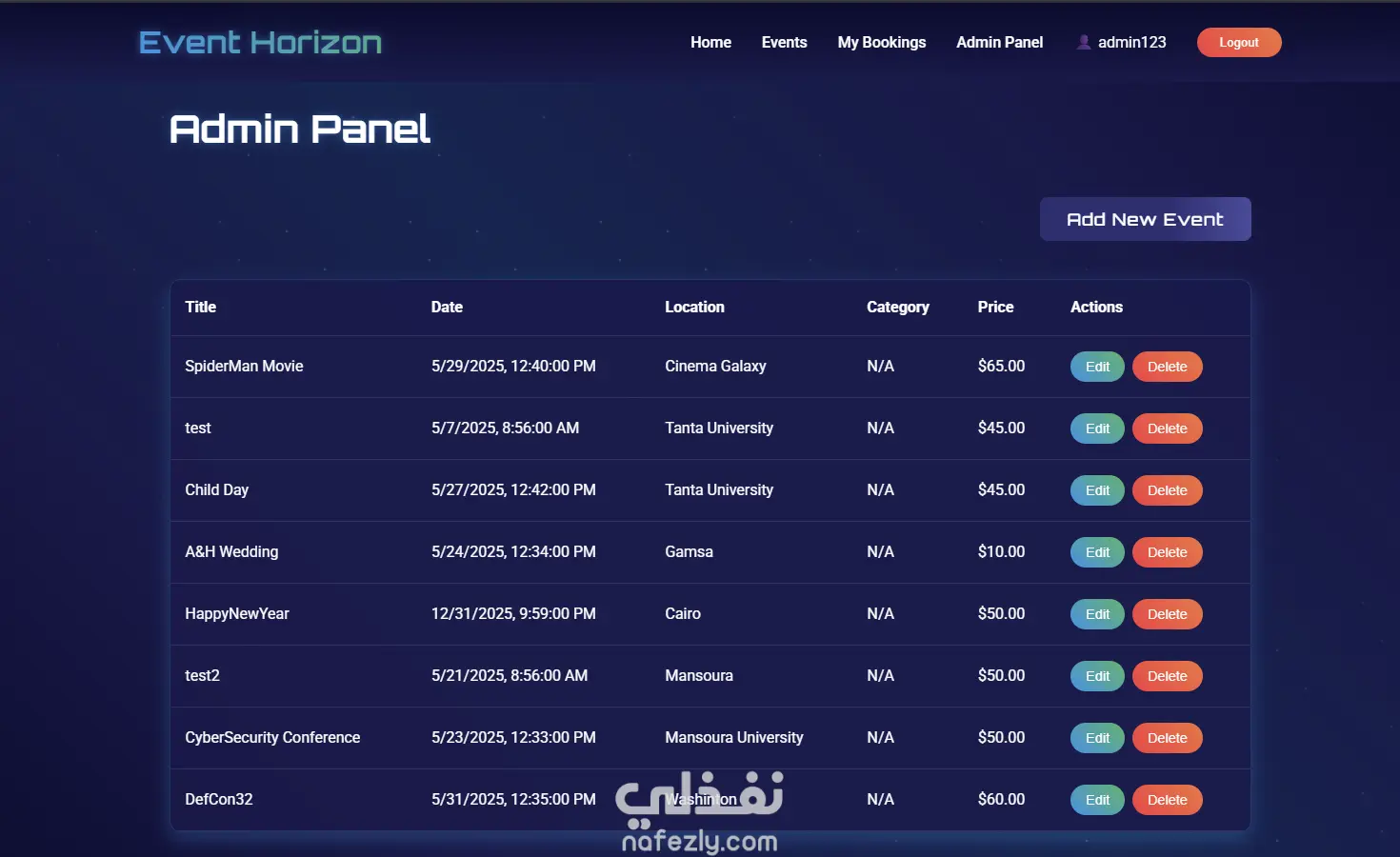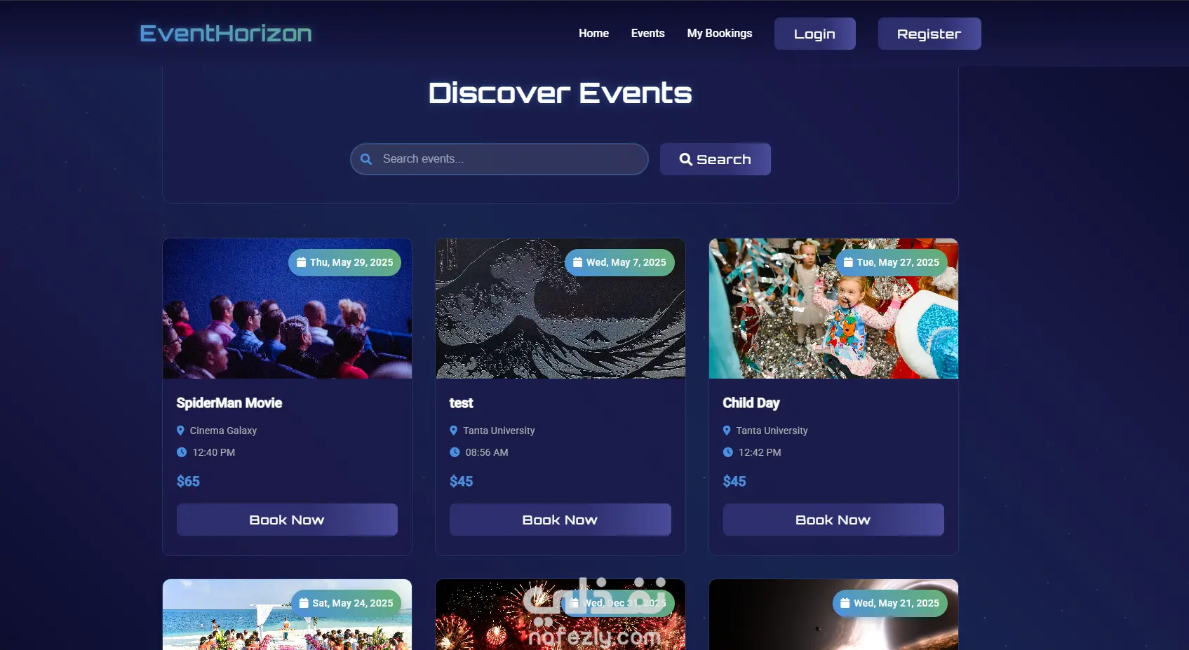 منصة حجز الفعاليات هي نظام إلكتروني يهدف إلى تسهيل عملية اكتشاف وحجز وحضور الأحداث المختلفة مثل المؤتمرات، الحفلات، الورش التدريبية، والندوات. تتيح المنصة للمستخدمين تصفح الفعاليات حسب النوع أو التاريخ أو الموقع، مع عرض تفاصيل كاملة لكل حدث تشمل الوصف، الموعد، المكان، والأسعار. كما توفر المنصة أيضا لوحة تحكم للمسؤولين.