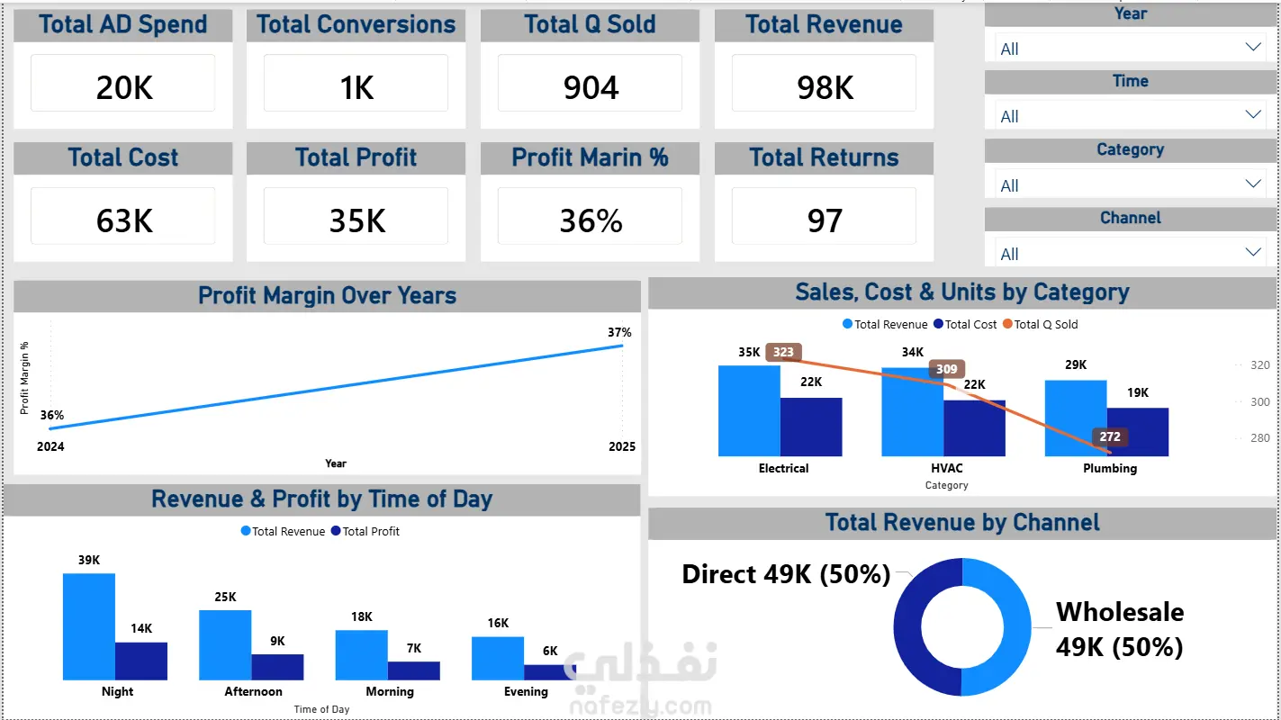 لوحة تحكم تفاعلية لتحليلات أداء التسويق والمبيعات لشركة FixIt Home Services، تغطي أقسام التدفئة والتهوية وتكييف الهواء (HVAC)، والكهرباء، والسباكة. توفر اللوحة رؤى فورية حول كفاءة الإنفاق الإعلاني، معدلات التحويل، الإيرادات، والربحية، مقسمة حسب وقت اليوم، فئة الخدمة، وقناة المبيعات (مباشرة مقابل الجملة). أبرز المميزات: المؤشرات الرئيسية (High-Level KPIs): إجمالي الإيرادات، الأرباح، الإنفاق الإعلاني، ومعدل التحويل. تحليل وقت اليوم (Time-of-Day Analysis): مقارنة الأداء بين الصباح، بعد الظهر، المساء، والليل. تحليل الخدمة والقناة (Service & Channel Breakdown): مؤشرات الأداء لكل فئة خدمة (HVAC، كهرباء، سباكة) وكل قناة مبيعات. متابعة الحملات (Campaign Tracking): جدول تفصيلي مع إمكانية تصفية حسب التاريخ، الفئة، القناة، وحالة المرتجعات. عرض العائد والربحية (ROI & Profitability Views): تصورات مقارنة الأرباح مقابل الإنفاق الإعلاني والعائد على الاستثمار لكل حملة. الاتجاهات والتنبيهات (Trends & Alerts): متابعة الاتجاهات التاريخية، التوقعات، والتنبيهات للحملات منخفضة الأداء. فلاتر تفاعلية (Interactive Filters): تخصيص حسب الفترة الزمنية، الفئة، القناة، ووقت اليوم. الهدف: تمكين اتخاذ قرارات مستندة إلى البيانات، تحسين ميزانيات التسويق، زيادة فعالية الحملات، وتعزيز الربحية العامة.