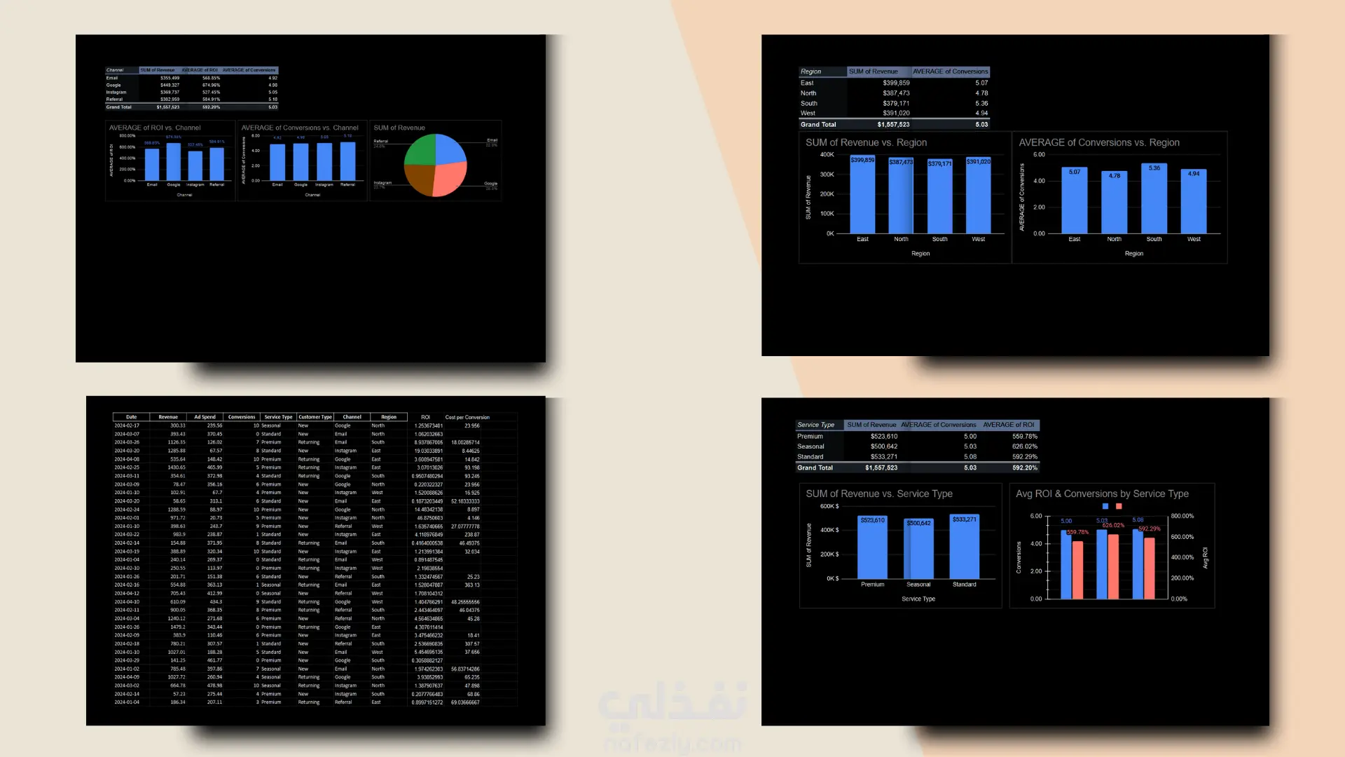 تحليل مجموعة بيانات وتحويلها إلى لوحات معلومات (Dashboards) سهلة القراءة تساعد على فهم الأداء واتخاذ قرارات مبنية على أرقام حقيقية. ما تم تنفيذه في هذا العمل: - تنظيف وتنظيم البيانات وتجهيزها للتحليل - إنشاء Pivot Tables لتحليل الإيرادات، معدلات التحويل، وROI - مقارنة الأداء حسب القنوات التسويقية، المناطق، ونوع الخدمة - تصميم رسوم بيانية ولوحة بيانات (Dashboard) واضحة - استخلاص Insights تساعد على فهم الأداء واتخاذ قرارات أدق