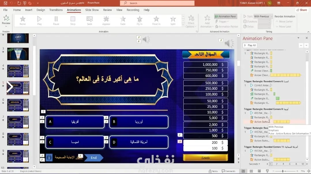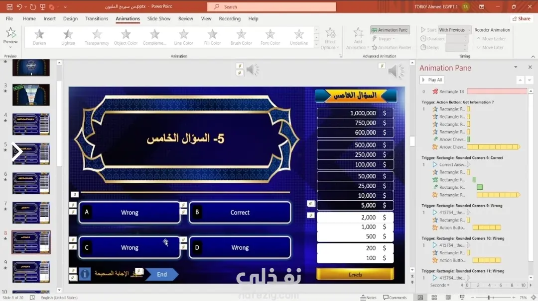 تصميم لعبة "من سيربح المليون" تفاعلية بالكامل على باوربوينت