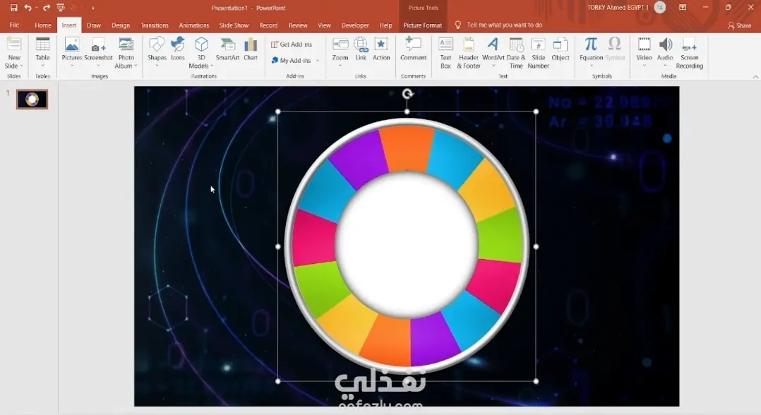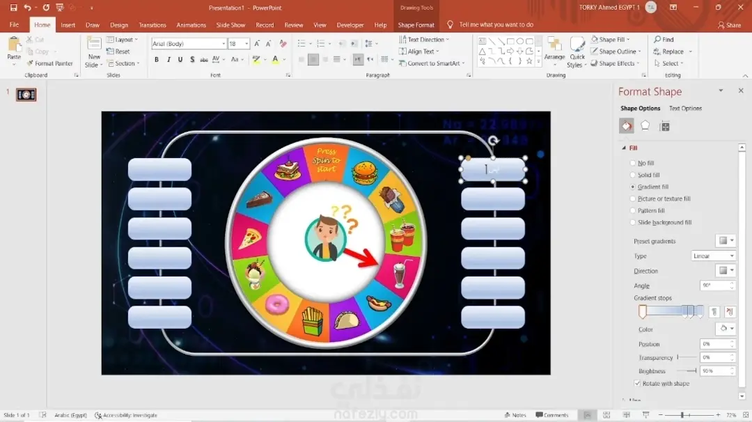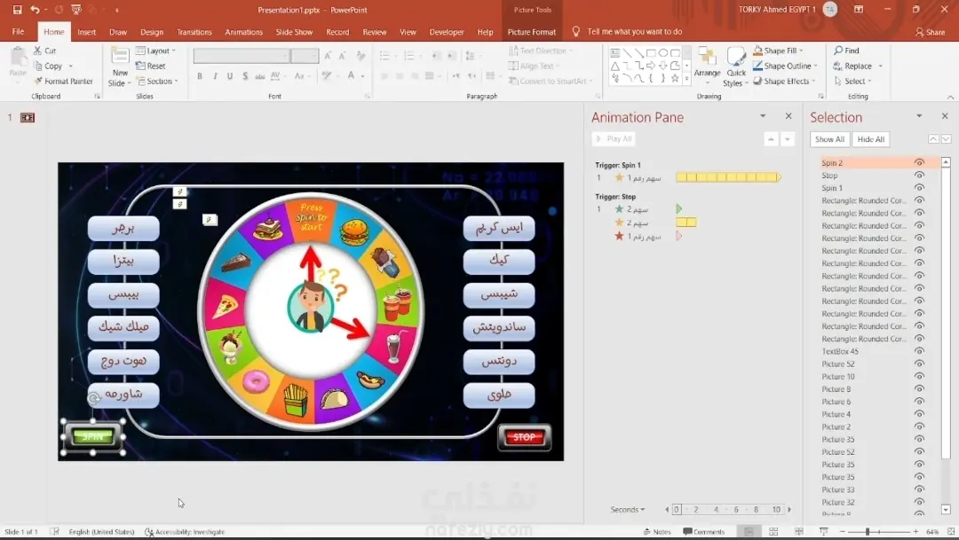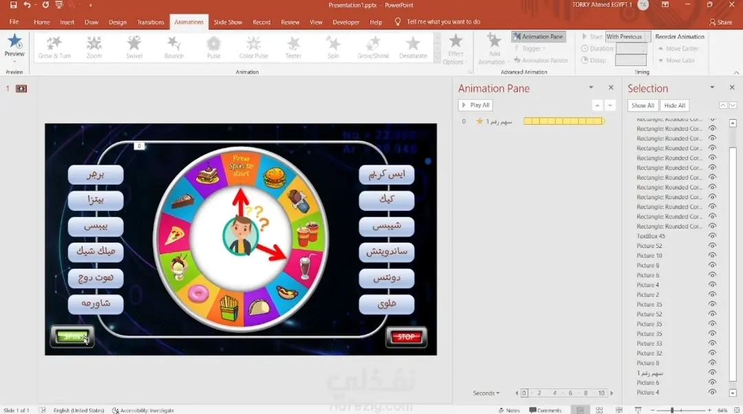 قمت بتصميم وبرمجة لعبة "العجلة الدوارة" (Spinning Wheel) تفاعلية بالكامل باستخدام برنامج PowerPoint. تهدف اللعبة لإضفاء جو من الحماس والإثارة في المسابقات، الفصول التعليمية، أو حتى القرعة الإلكترونية. أبرز المميزات التقنية: تحكم كامل بالحركة: اللعبة لا تتوقف تلقائياً بعد وقت محدد، بل قمت ببرمجة زر "توقف" (Stop) خاص يسمح للمستخدم بإيقاف العجلة في اللحظة التي يريدها لاختيار الفائز، مما يزيد من التشويق. تخصيص كامل: العجلة مصممة بحيث يمكن تغيير النصوص (أسماء جوائز، أسماء طلاب، خيارات طعام..) بسهولة تامة كما يظهر في الصور. تصميم مرن: إمكانية زيادة أو تقليل عدد الخانات في العجلة. مؤثرات حركية واقعية: ضبطت سرعة الدوران لتبدو طبيعية وسلسة. استخدامات القالب: مثالي للمعلمين (لاختيار الطلاب عشوائياً)، المدربين (لتوزيع الجوائز)، أو صناع المحتوى لعمل سحوبات تفاعلية.