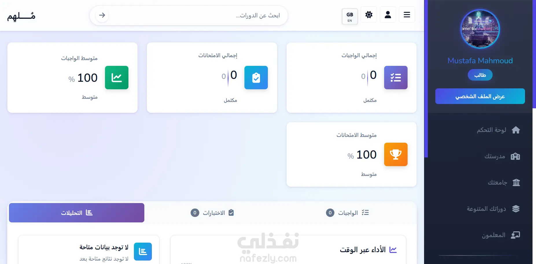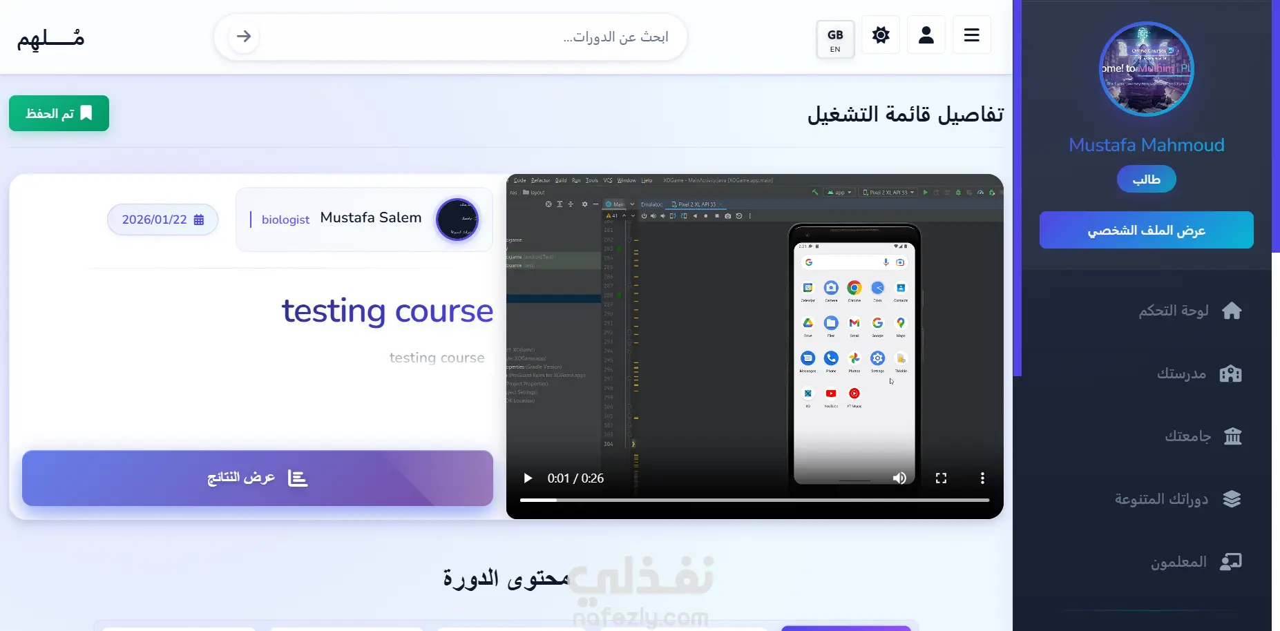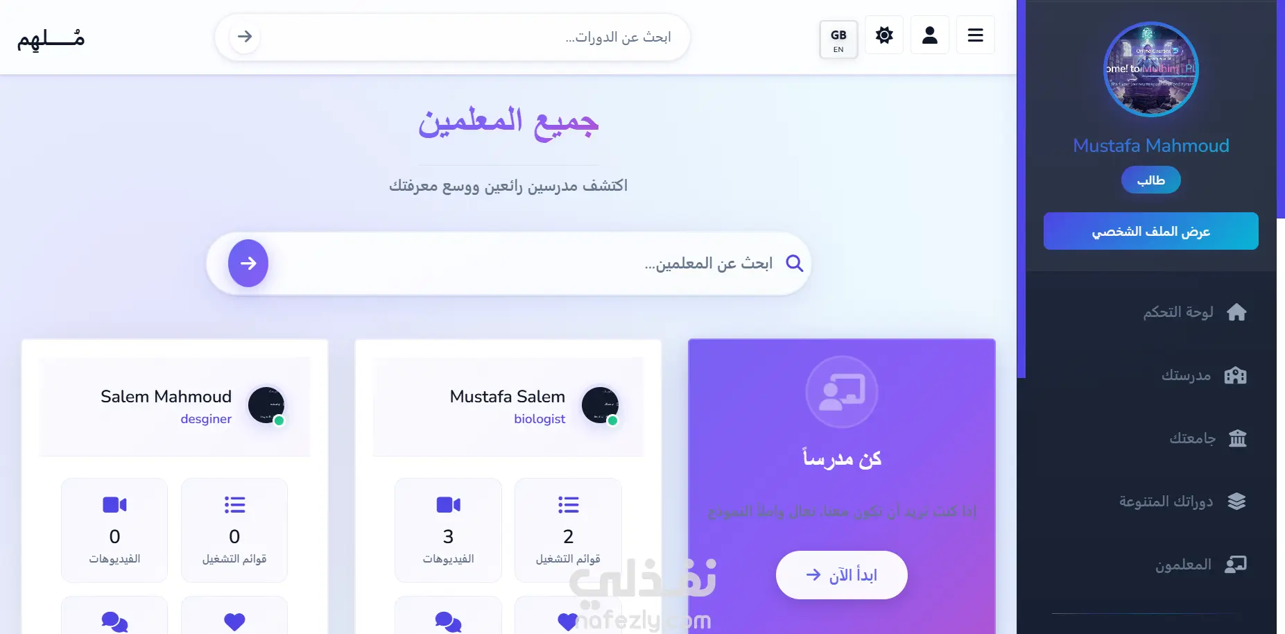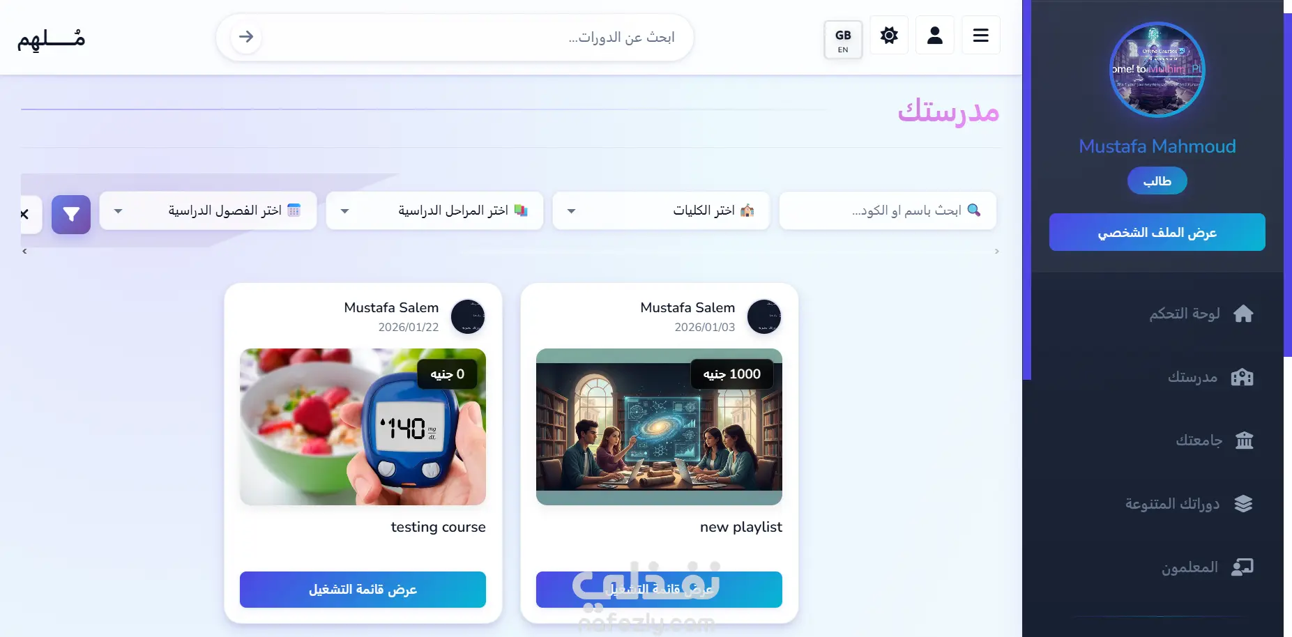المنصة توفر نظامًا متكاملًا لإدارة العملية التعليمية بدايةً من إضافة المدرسين والكورسات، مرورًا ببيع المحتوى التعليمي، وحتى متابعة أداء الطلاب والتفاعل مع المحتوى، مع واجهات مرنة تناسب جميع المستخدمين.