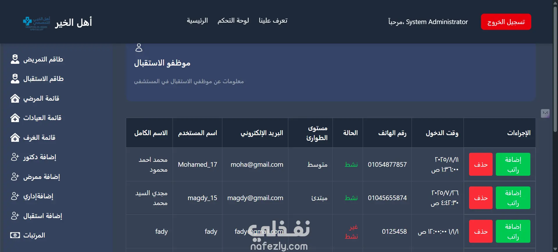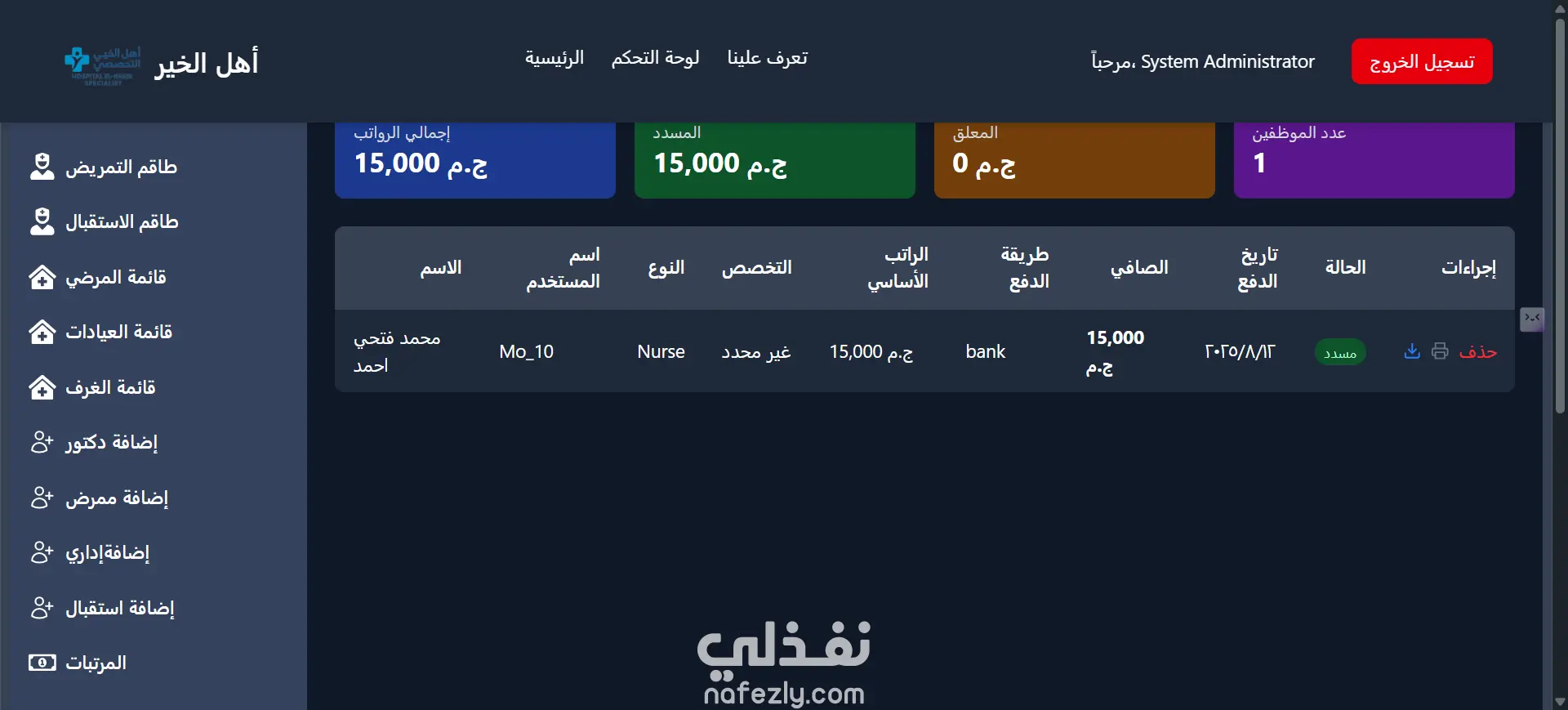 إدارة الطاقم الطبي والممرضين: تنظيم سجلات الأطباء والممرضين، مع نظام آلي دقيق لحساب الرواتب والعمليات المالية الخاصة بكل فرد في الفريق.