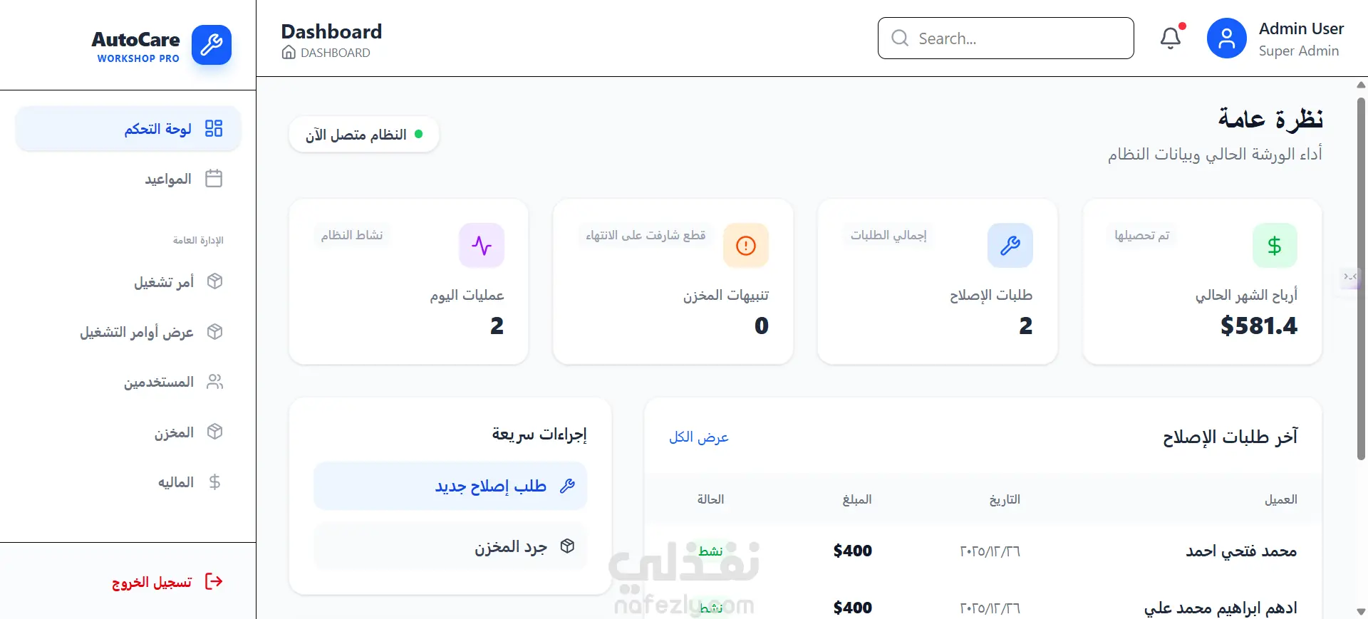 هذا النظام هو استثمارك الأمثل إذا كنت تمتلك مركز صيانة وتريد تنظيمه، احترافية في التعامل مع العملاء، ورقابة كاملة على المخزن والأرباح