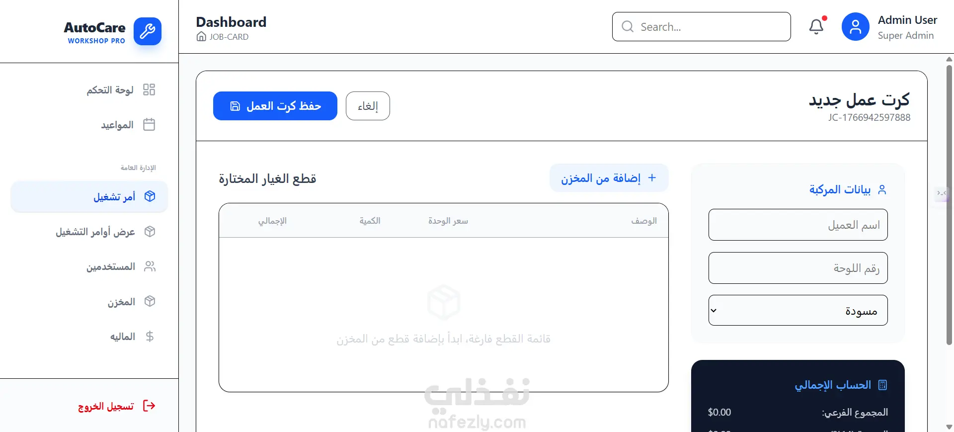 حسابات دقيقة وفورية: يقوم النظام بحساب إجمالي الفاتورة آلياً فور إضافة الخدمات أو القطع، مما يوفر وقتك ويضمن دقة حساباتك مع العملاء.
