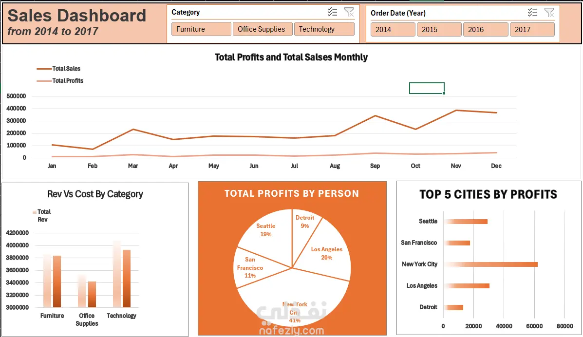 بعد ربط مجموعة بيانات المبيعات بالبيانات في برنامج Excel ✅ بدأتُ بتنظيف البيانات باستخدام Power Query: 1️⃣ إزالة البيانات المكررة. 2️⃣ حذف المسافات الزائدة. 3️⃣ تصحيح التنسيقات. 4️⃣ توحيد الوحدات. ✅ بعد ذلك، انتقلتُ إلى معالجة البيانات باستخدام Power Query وDAX (تعبيرات تحليل البيانات). ✅ حساب البيانات الإحصائية اللازمة لاستخلاص النتائج (الإيرادات وإجمالي الإيرادات، التكلفة وإجمالي التكلفة). ✅ ثم بدأتُ باستخلاص النتائج باستخدام الجداول المحورية وPower Pivot. ١️- تصفية البيانات للحصول على النتائج الأكثر أهمية. ٢️- إضافة أدوات التصفية وجعلها تفاعلية مع جميع الجداول المحورية. ٣️- إدراج مخططات خطية مكدسة، ومخططات عمودية مكدسة، ومخططات دائرية، ومخططات شعاعية لاستخدامها في الرسوم البيانية. ? وأخيرًا، انتقلتُ إلى لوحة المعلومات المرئية. والتي تُظهر: ١️- إجمالي المبيعات مقابل إجمالي الأرباح شهريًا ٢️- إيرادات كل فئة مقابل تكلفة كل فئة ٣️- إجمالي أرباح كل عميل ٤️- أفضل ٥ مدن من حيث إجمالي المبيعات