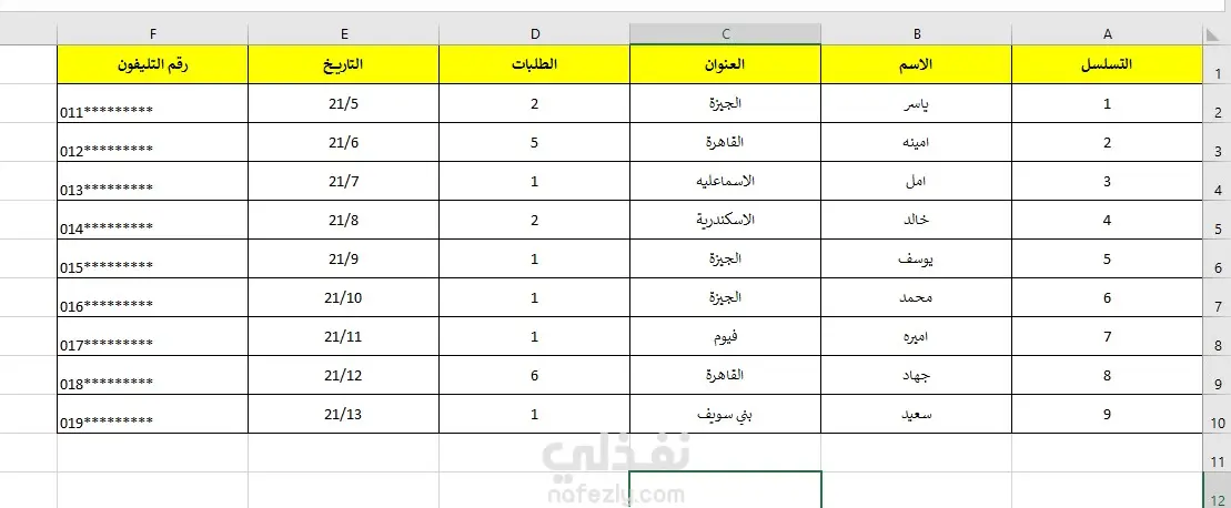 🔹 نموذج إدخال بيانات باستخدام Excel 🔹 بيانات تجريبية منظمة بدقة 🔹 تنسيق وفلترة وترتيب احترافي 🔹بيانات تجريبية / وهمية