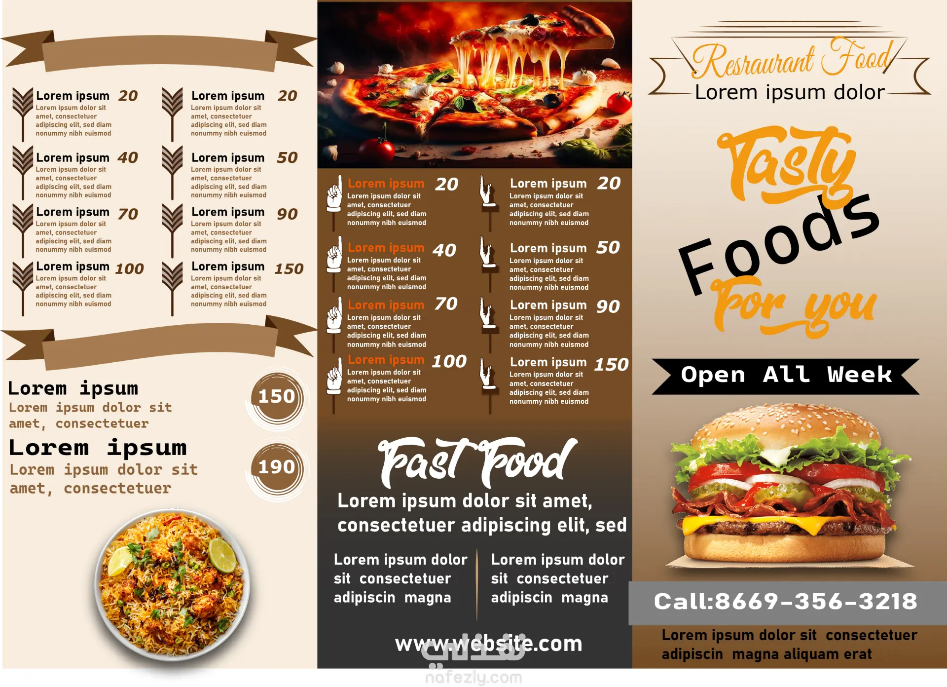 تصميم منيو مطعم بنظام الطيّتين بأسلوب عصري يجمع بين التنظيم الواضح للأصناف والأسعار والتوازن البصري الجذاب. يركز التصميم على إبراز الصور والعناوين بشكل احترافي مع قابلية التخصيص الكاملة بما يتناسب مع هوية أي مطعم. الأداة المستخدمة: Adobe Illustrator