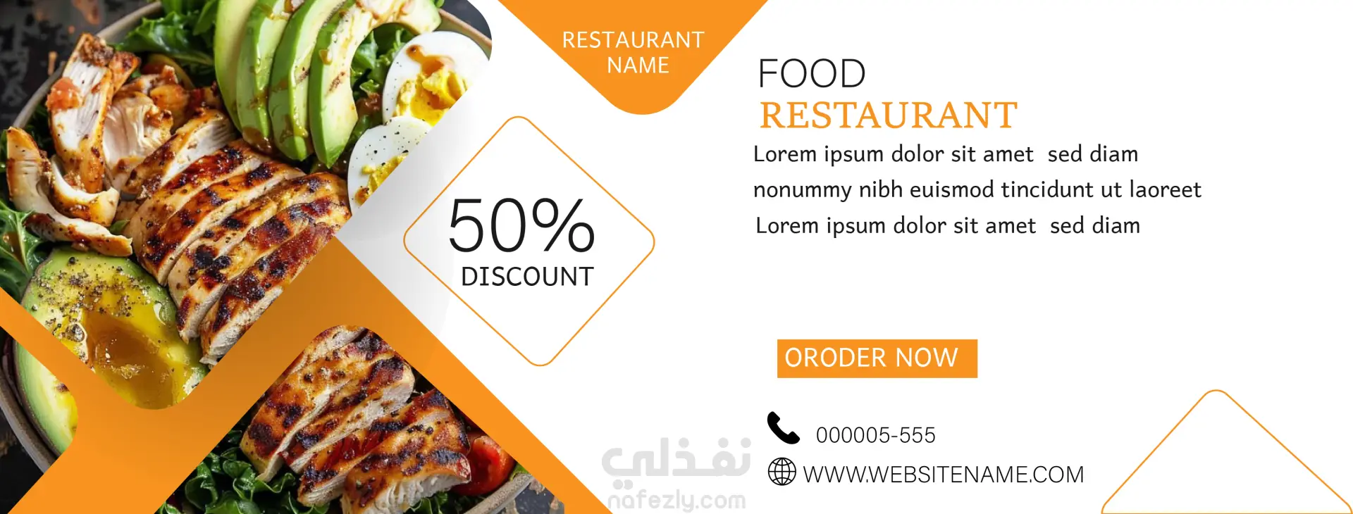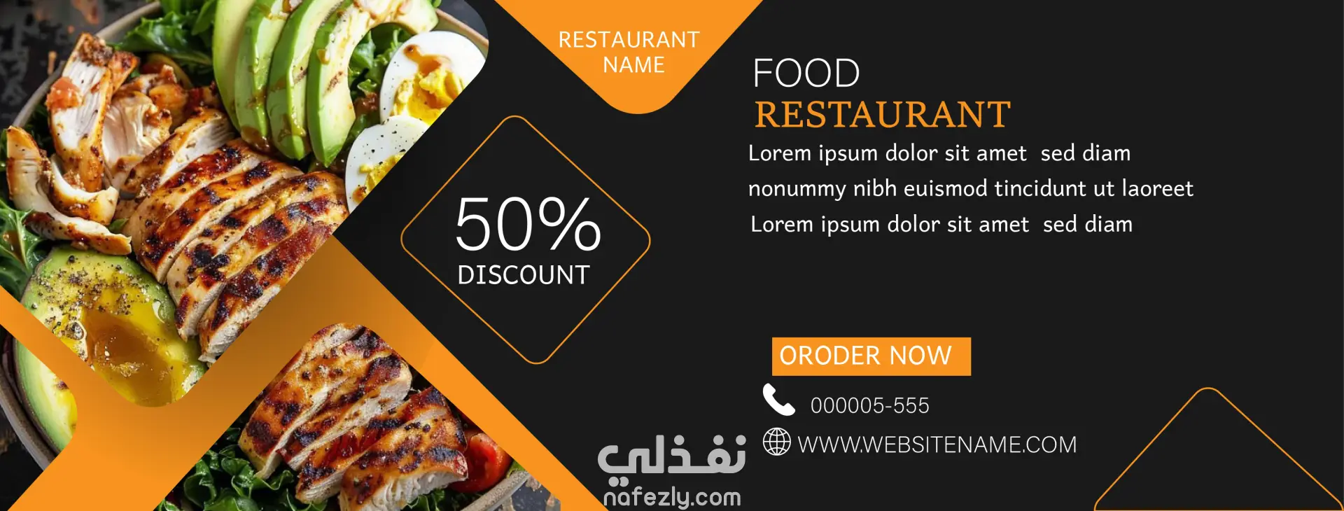 تصميم بانر إعلاني احترافي وعصري خاص بالمطاعم والكافيهات، مناسب للإعلانات على السوشيال ميديا أو للطباعة، بنفس الأسلوب الظاهر في النموذج المرفق.
