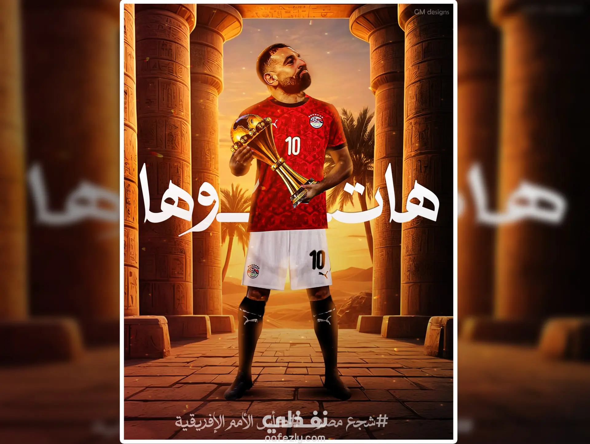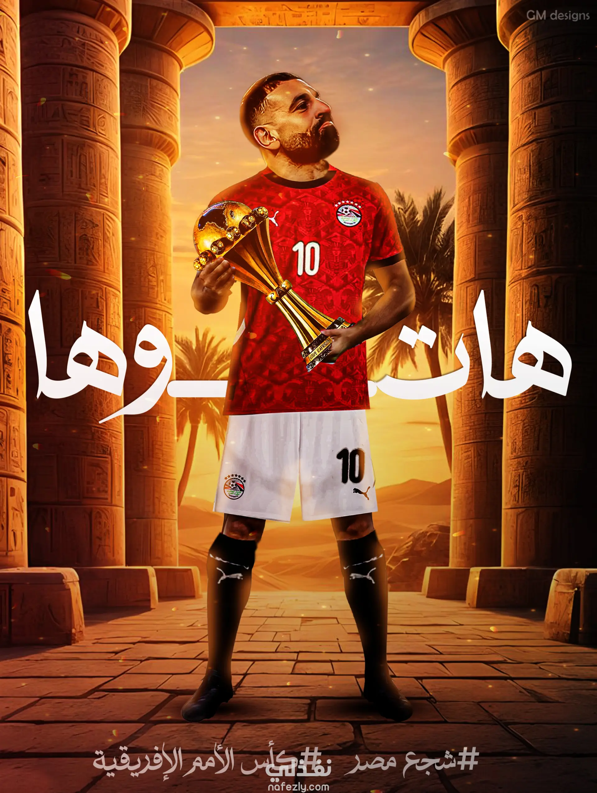 يجسد التصميم هيبة التاريخ المصري من خلال الأعمدة الفرعونية الشامخة، التي تحتضن بطلًا يحمل كأس الأمم الأفريقية بروح الانتصار.
