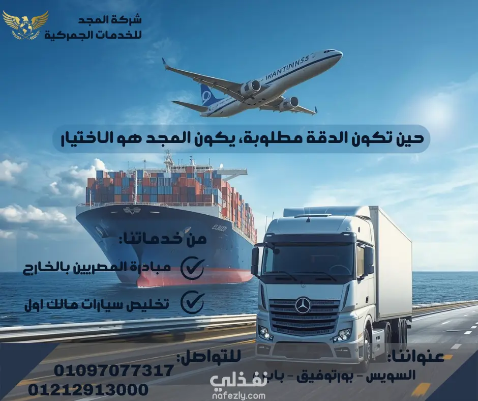 الإعلان بيقدّم شركة المجد للخدمات الجمركية بشكل احترافي وواضح، وبيعكس فكرة التكامل في خدمات الشحن والتخليص من خلال الجمع بين النقل الجوي والبحري والبري في صورة واحدة. وجود الطائرة والسفينة وشاحنة النقل بيوصل رسالة إن الشركة قادرة تتعامل مع أي نوع شحن وبأي وسيلة.