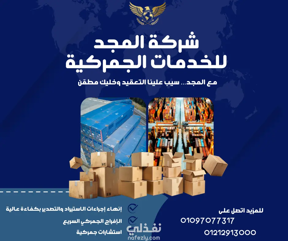 التصميم ده إعلان واضح ومرتب لشركة المجد للخدمات الجمركية، بيركّز على الثقة والاحتراف في مجال الاستيراد والتصدير. استخدام خريطة العالم والخلفية الزرقاء بيدي إحساس بالانتشار العالمي والتنظيم، وصور الحاويات والكراتين بتعبّر عن حجم الشغل وسلاسة حركة البضائع.
