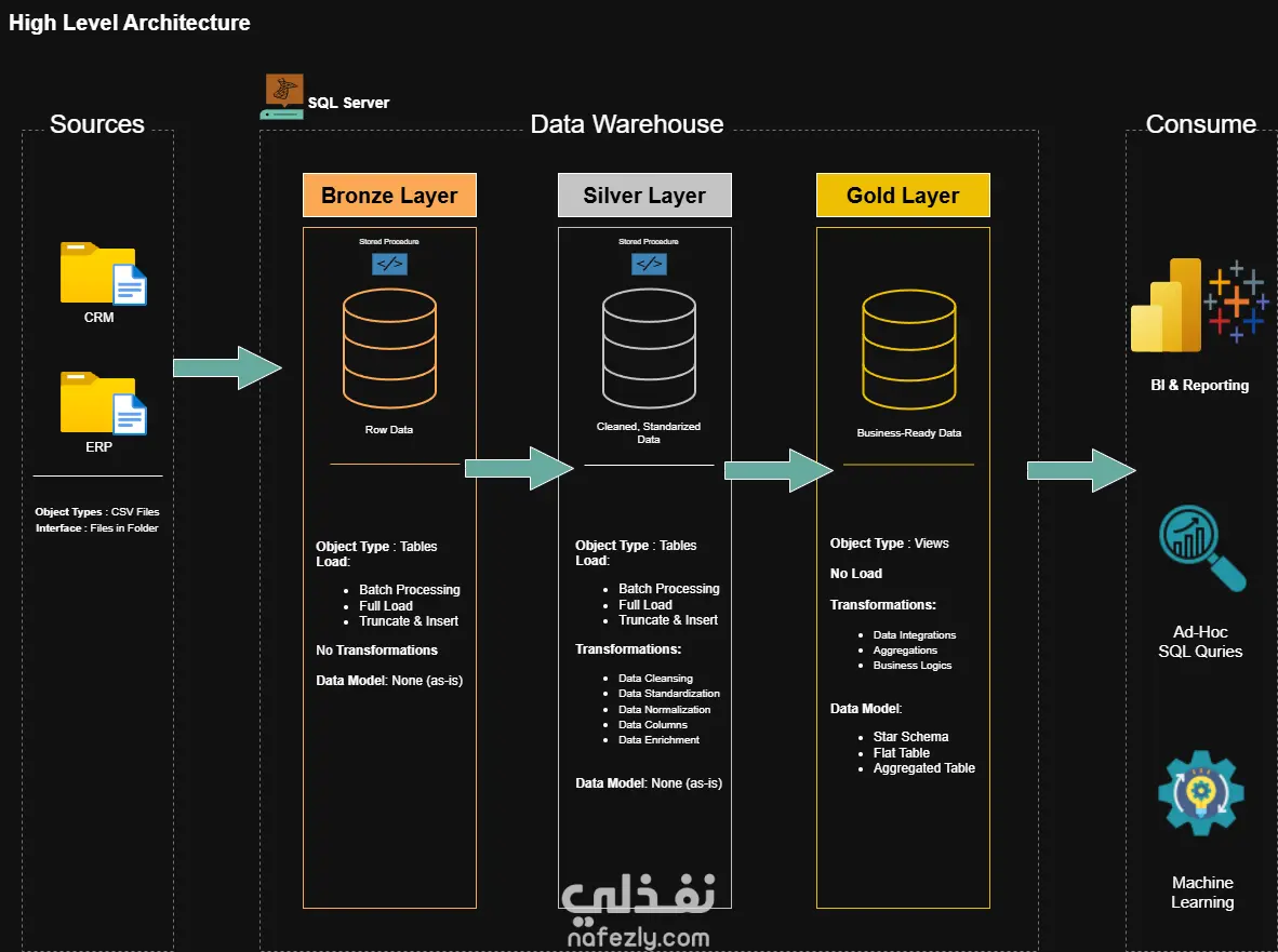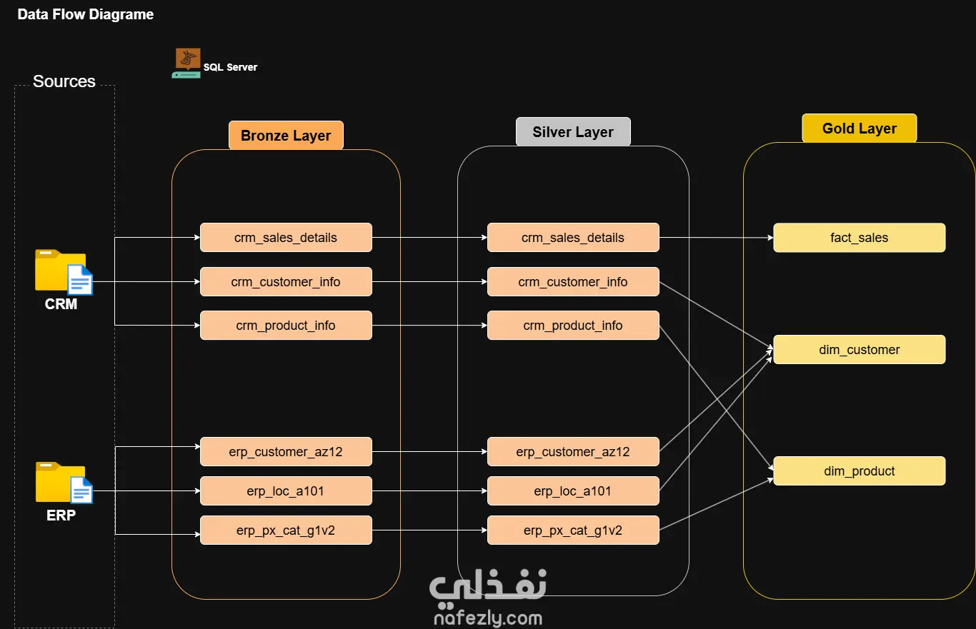 🏗️ مشروع مستودع بيانات وتحليلات – Data Warehouse & Analytics حل متكامل لبناء مستودع بيانات احترافي بدءًا من تصميم البنية، مرورًا بخطوط الـ ETL، وصولًا إلى استخراج رؤى تحليلية تدعم اتخاذ القرار. المشروع يطبق أفضل الممارسات الصناعية في هندسة البيانات والتحليلات. 🚀 نظرة عامة عن المشروع تم تنفيذ هذا المشروع لبناء مستودع بيانات حديث باستخدام SQL Server بهدف: • تجميع بيانات المبيعات من عدة مصادر (ERP + CRM) • تنظيفها ومعالجتها • تحويلها إلى نموذج تحليلي موحّد • تجهيز تقارير SQL تدعم القرارات التجارية 🎯 الهدف: تحويل بيانات تشغيلية مبعثرة إلى منصة بيانات مركزية جاهزة للتحليل واتخاذ القرار. 🏗️ هندسه البيانات تم الاعتماد على Medallion Architecture بثلاث طبقات: • 🥉 Bronze Layer – البيانات الخام • تخزين البيانات كما هي من المصدر • استيراد ملفات CSV إلى SQL Server • الحفاظ على النسخة الأصلية بدون تعديل 🥈 Silver Layer – طبقة المعالجة • تنظيف البيانات • توحيد الصيغ • معالجة الأخطاء والقيم المفقودة • توحيد المفاتيح بين الأنظمة 🥇 Gold Layer – طبقة التحليل • بناء نموذج Star Schema • إنشاء جداول أبعاد وحقائق • تجهيز بيانات جاهزة للتقارير والتحليل 🛠 الأدوات والتقنيات • SQL Server Express • SQL Server Management Studio (SSMS) • تطوير SQL • ETL Pipelines • Data Modeling • Data Architecture • Git & Notion • DrawIO للتصميم الهيكلي للمشروع 📦 مكونات المشروع 1️⃣ تصميم معمارية مستودع البيانات • بناء هيكل حديث يعتمد على Bronze → Silver → Gold • توثيق تدفق البيانات بين الطبقات 2️⃣ خطوط ETL • استخراج البيانات من أنظمة ERP و CRM • تحويلها ومعالجتها • تحميلها في طبقات المستودع 3️⃣ نمذجة البيانات • إنشاء Fact & Dimension Tables • تصميم Star Schema للأداء التحليلي 4️⃣ التحليلات والتقارير • استعلامات SQL متقدمة • تحليل: • سلوك العملاء • أداء المنتجات • اتجاهات المبيعات 📁 هيكل المستودع • مجلد للبيانات الخام • سكربتات لكل طبقة (Bronze / Silver / Gold) • توثيق: • Data Catalog • Data Flow • Naming Conventions • Data Models 🎯 المهارات التي يبرزها المشروع ✔ تصميم مستودعات البيانات ✔ تطوير SQL متقدم ✔ بناء ETL Pipelines ✔ نمذجة البيانات التحليلية ✔ هندسة بيانات ✔ تحليلات الأعمال 📌 المميزات الرئيسية • دمج بيانات من نظامين مختلفين (ERP + CRM) • معالجة مشاكل جودة البيانات قبل التحليل • إنشاء نموذج موحّد سهل الاستخدام • التركيز على أحدث البيانات دون تعقيد historization • توثيق كامل موجه لفرق الأعمال والتحليل • تحليلات SQL جاهزة لاتخاذ القرار 🌟 القيمة العملية • يساعد هذا المشروع الشركات على: • بناء بنية بيانات مركزية • تقليل تضارب الأرقام بين الأنظمة • تسريع إعداد التقارير • دعم القرارات المبنية على البيانات