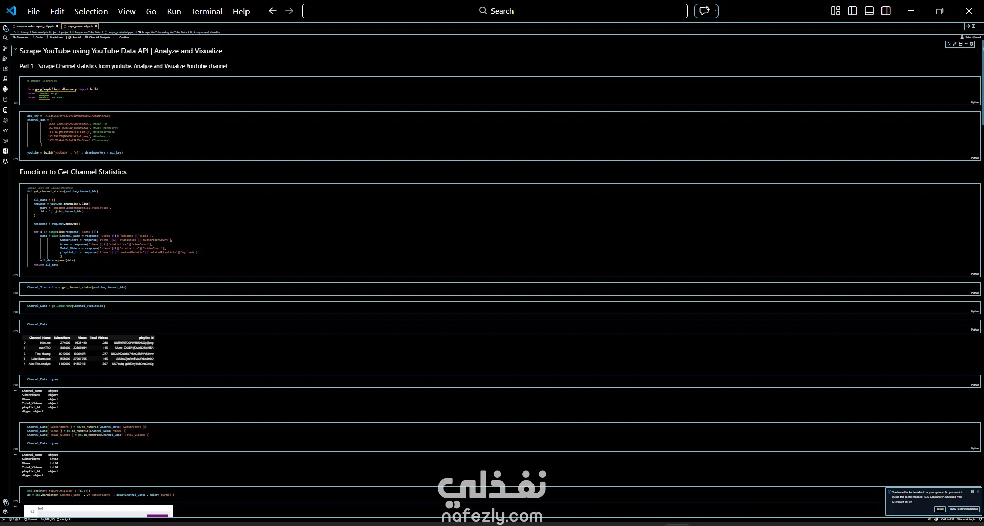 📊 YouTube Channel Analytics Project – تحليل قنوات يوتيوب باستخدام API مشروع تحليل بيانات متكامل يعتمد على YouTube Data API v3 لدراسة أداء أشهر صُنّاع محتوى تحليل البيانات، مع إنشاء تصورات بيانية احترافية باستخدام: Python – Pandas – Matplotlib – Seaborn 🚀 فكرة المشروع والهدف منه : • جمع بيانات فعلية من يوتيوب عبر API • تحليل أداء القنوات والفيديوهات • استخراج مؤشرات التفاعل • تحويل الأرقام إلى رؤى قابلة لاتخاذ القرار • المشروع يوضح رحلة تحليل البيانات كاملة: 📥 جمع البيانات → 🧹 تنظيفها → 📊 تحليلها → 🎨 عرضها بصرياً 🧰 التقنيات المستخدمة • Python 🐍 • YouTube Data API v3 ▶️ رPandas 🐼 • Matplotlib 📊 • Seaborn 🌊 • NumPy 🔢 📥 مصادر البيانات تم تحليل 5 قنوات متخصصة في مجال تحليل البيانات: • techTFQ • Alex The Analyst • Luke Barousse • Ken Jee • Tina Huang والبيانات التي تم استخراجها: ✔ إحصائيات القنوات: • عدد المشتركين • إجمالي المشاهدات • عدد الفيديوهات ✔ بيانات الفيديوهات: • العنوان • تاريخ النشر • عدد المشاهدات • الإعجابات • التعليقات ✔ مؤشرات التفاعل: • Likes/View • Comments/View • Engagement Rate 📊 التحليلات والتصورات المنفذة 1️⃣ مقارنة القنوات • تحليل شامل بين القنوات من حيث: • عدد المشتركين • المشاهدات • متوسط المشاهدات لكل فيديو • قوة التفاعل 2️⃣ أعلى 10 فيديوهات مشاهدة تحليل يوضح: • نوع المحتوى الأكثر انتشاراً • المواضيع الجاذبة • تأثير العنوان والتوقيت 3️⃣ توزيع النشر شهرياً • تحديد مواسم النشاط • فترات الذروة • علاقة التوقيت بالمشاهدات 4️⃣ النمو التراكمي للمشاهدات • تحليل زمني لنمو القنوات • مقارنة الاستمرارية مقابل النتائج 5️⃣ تحليل التفاعل • علاقة المشاهدات بالإعجابات • قوة المجتمع حول القناة • جودة المحتوى مقابل الانتشار 6️⃣ تحليل سنوي • عدد الفيديوهات سنوياً • إجمالي المشاهدات لكل سنة • تأثير الاستمرارية 7️⃣ علاقة الإعجابات بالتعليقات • إثبات الارتباط الإيجابي • قياس قوة المجتمع التفاعلي 📦 مخرجات المشروع سيتم تسليم: ✅ ملفات CSV منظمة: • Channel_Statistics.csv • Video_Details.csv ✅ رسوم بيانية محفوظة PNG ✅ كود Python كامل ومشروح ✅ تقرير تحليلي بالاستنتاجات ✅ ملف جاهز للتطوير إلى داشبورد 🎯 أهم الاستنتاجات ✔ الجودة أهم من الكمية في التفاعل ✔ الاستمرارية = نمو تراكمي قوي ✔ بعض الفيديوهات ذات وصول أقل لكن تأثير أعلى ✔ نوع المحتوى يحدد معدل التفاعل أكثر من عدد المتابعين 🌟 قيمة المشروع المشروع يثبت قدرتي على: • التعامل مع APIs حقيقية • بناء Data Pipeline • تنظيف البيانات • التحليل الاستكشافي • السرد القصصي بالبيانات • إنشاء Visualizations احترافية ويمكن تطبيق نفس الفكرة على: • تحليل قنوات الشركات • قياس أداء المحتوى • تحسين استراتيجيات التسويق • دراسة المنافسين 📌 ما يمكن تطويره لاحقاً • إضافة قنوات جديدة • تحليل نصوص العناوين NLP • بناء داشبورد تفاعلي • أتمتة التحديث اليومي 📋 المتطلبات من العميل يرجى تحديد: 1️⃣ القنوات المطلوب تحليلها 2️⃣ الفترة الزمنية 3️⃣ نوع التقارير المطلوبة 4️⃣ داشبورد أم تقرير فقط؟
