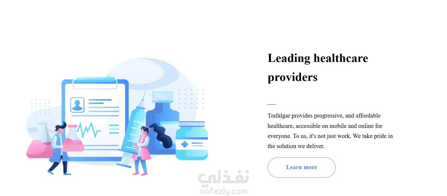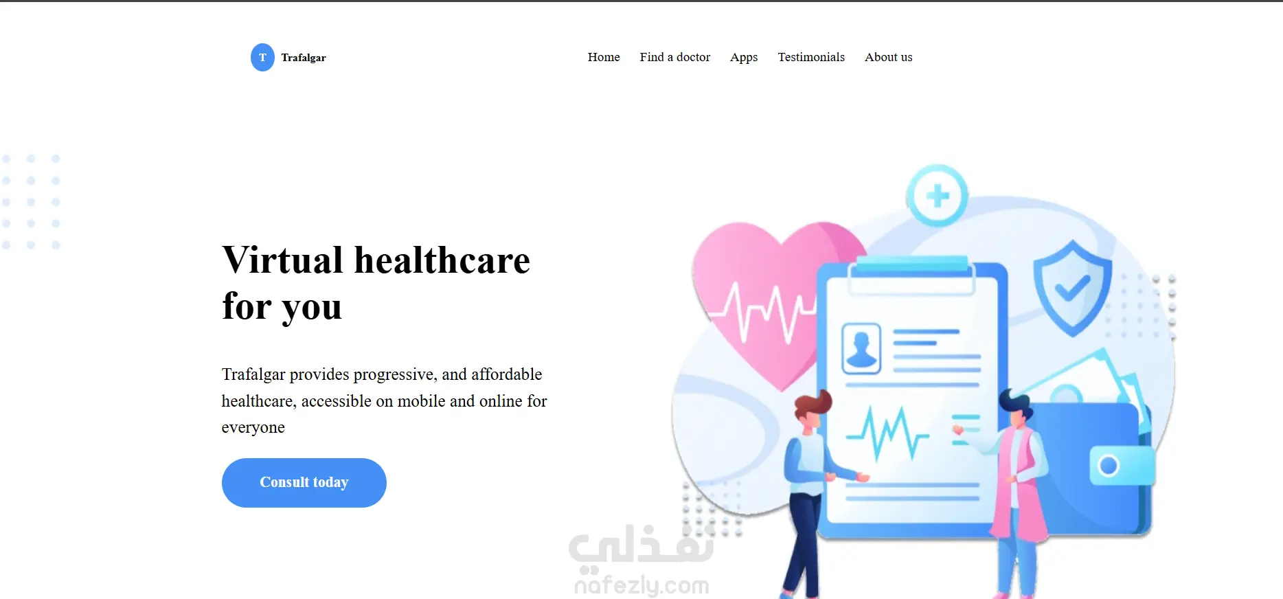 Trafalgar هو موقع خدمات رعاية صحية رقمية بيهدف لتقديم استشارات طبية سهلة وسريعة أونلاين. المنصة بتوفر خدمات متنوعة زي حجز الأطباء، الاستشارات الطبية، الصيدلية الإلكترونية، وتتبع التاريخ الصحي، مع تصميم بسيط وتجربة استخدام سلسة تضمن وصول الرعاية الصحية لكل المستخدمين في أي وقت ومن أي مكان.