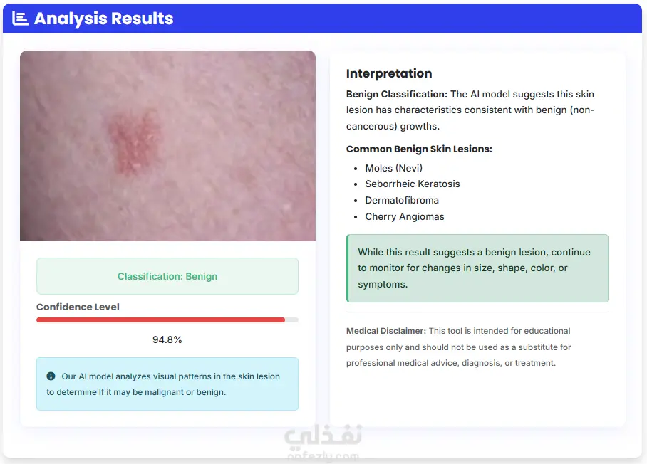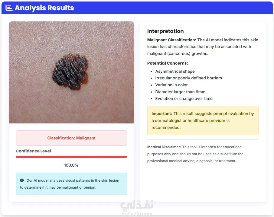 قمت بتطوير نموذج ذكاء اصطناعي مدعوم بشبكات عصبية عميقة (CNN) لتصنيف صور الآفات الجلدية إلى نوعين: حميد وخبيث. النموذج تم تدريبه على بيانات طبية واقعية ويتميز بدقة عالية في التنبؤ بناءً على تحليل بصري دقيق للبشرة. تم تحسين النموذج باستخدام تقنيات زيادة البيانات (Data Augmentation) وقيّمت الأداء بدقة باستخدام confusion matrix and medical metrics such as (accuracy, recall, and F1-score). التقنيات المستخدمة: - Python - TensorFlow / Keras - CNN - Image Preprocessing & Augmentation - Classification Metrics ما يميز المشروع: - مناسب للتطبيقات الطبية التوعوية أو التشخيص المساعد - واجهة مبسطة لرفع الصور والحصول على النتيجة فورًا - إمكانية التوسعة لدعم أنواع أكثر من السرطانات الجلدية