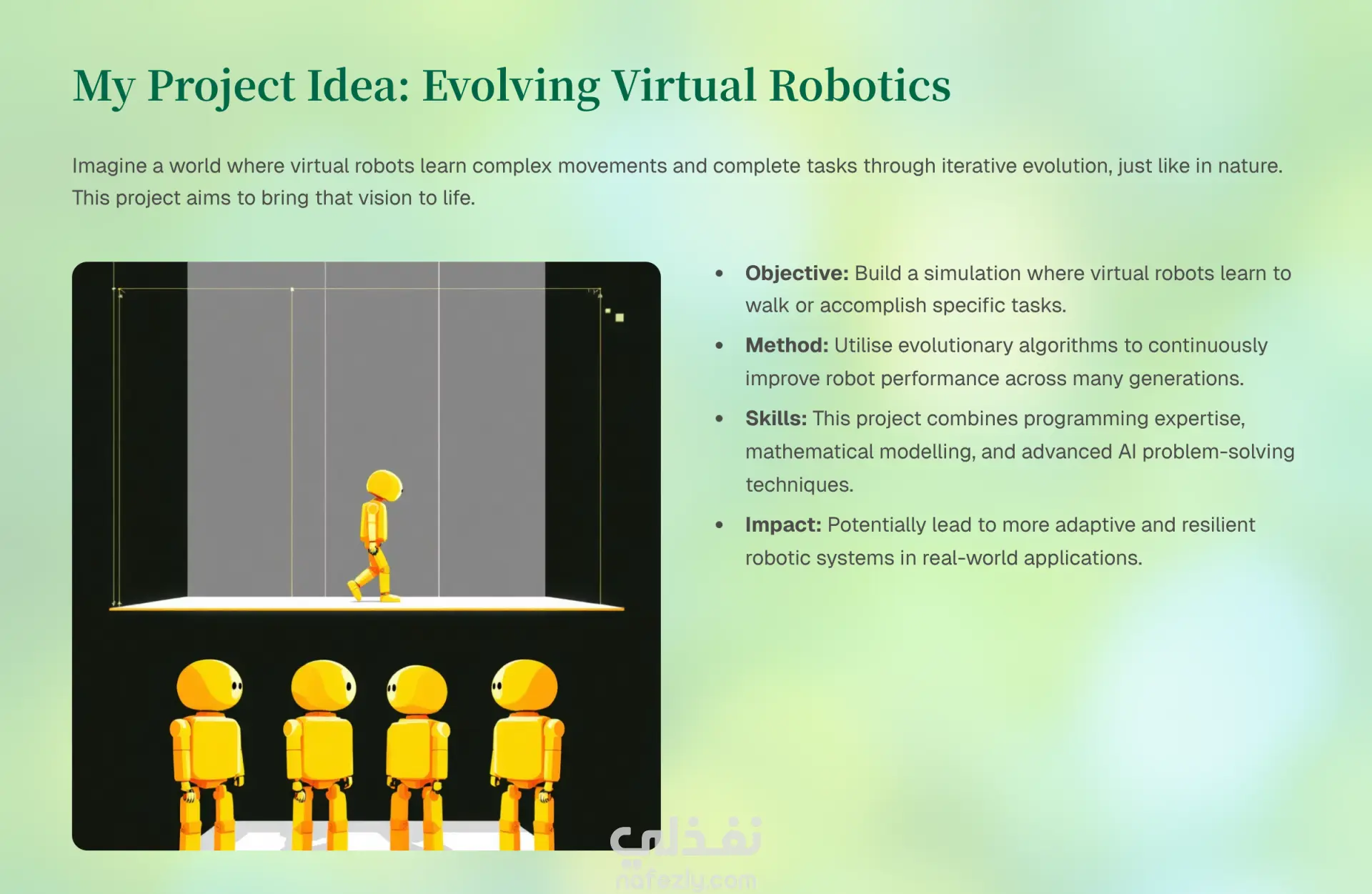 قمت بإعداد عرض تقديمي احترافي (Presentation) يشرح الخوارزميات التطورية (Evolutionary Algorithms) بشكل مبسّط ومنظم، مناسب للأغراض الأكاديمية والتعليمية. يشمل العمل: شرح مفهوم Evolutionary Algorithms وأساسها العلمي توضيح آلية العمل (Population – Fitness – Selection – Crossover – Mutation) عرض الفكرة بأسلوب تدريجي وسهل الفهم تنظيم المحتوى بشكل منطقي ومتسلسل تصميم شرائح واضحة ومرتبة تدعم الفهم البصري مناسب للطلاب، العروض الجامعية، أو الشرح التمهيدي للذكاء الاصطناعي تم التركيز في هذا العمل على: تبسيط المفاهيم المعقدة بدون الإخلال بالمحتوى العلمي الربط بين الجانب النظري والتطبيقي إخراج العرض بشكل احترافي يصلح للتقديم المباشر - يمكن تنفيذ أعمال مشابهة أو مخصصة حسب: المستوى الأكاديمي عدد الشرائح اللغة (عربي / إنجليزي) نوع الجمهور المستهدف