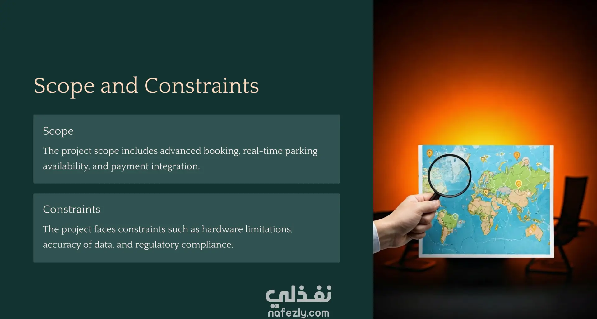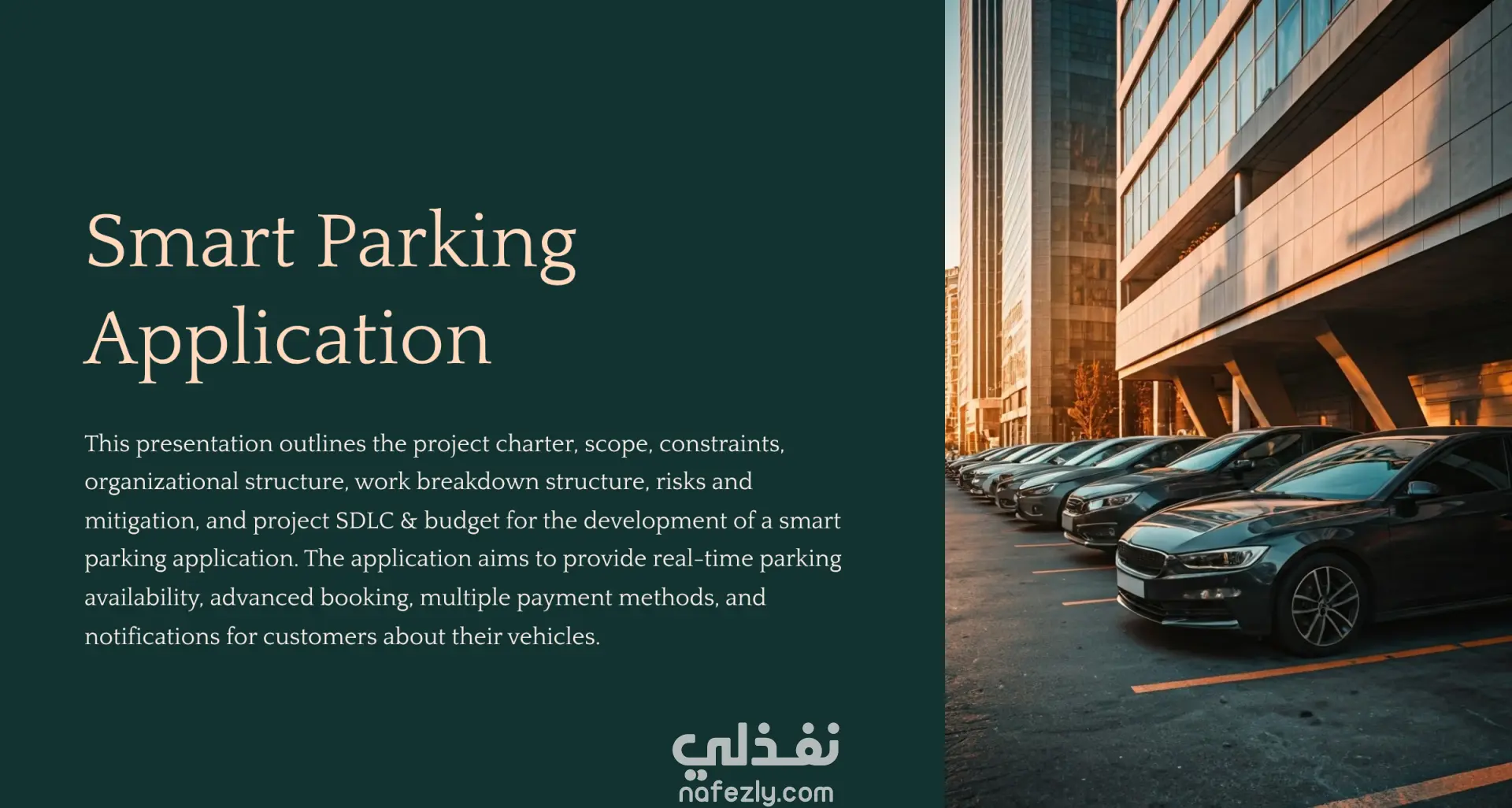 عرض تقديمي احترافي يشرح فكرة تطبيق المواقف الذكية (Smart Parking) كحل تقني لمشكلة صعوبة إيجاد أماكن انتظار السيارات.