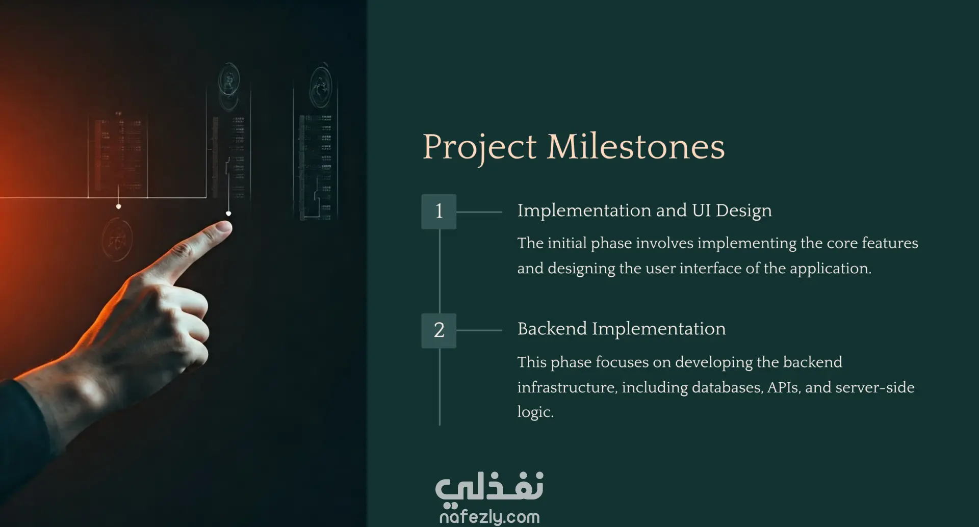 يتضمن توضيح فكرة التطبيق، آلية العمل، تجربة المستخدم، ومكونات النظام بأسلوب مبسّط ومنظم، مع تصميم شرائح حديثة وواضحة.