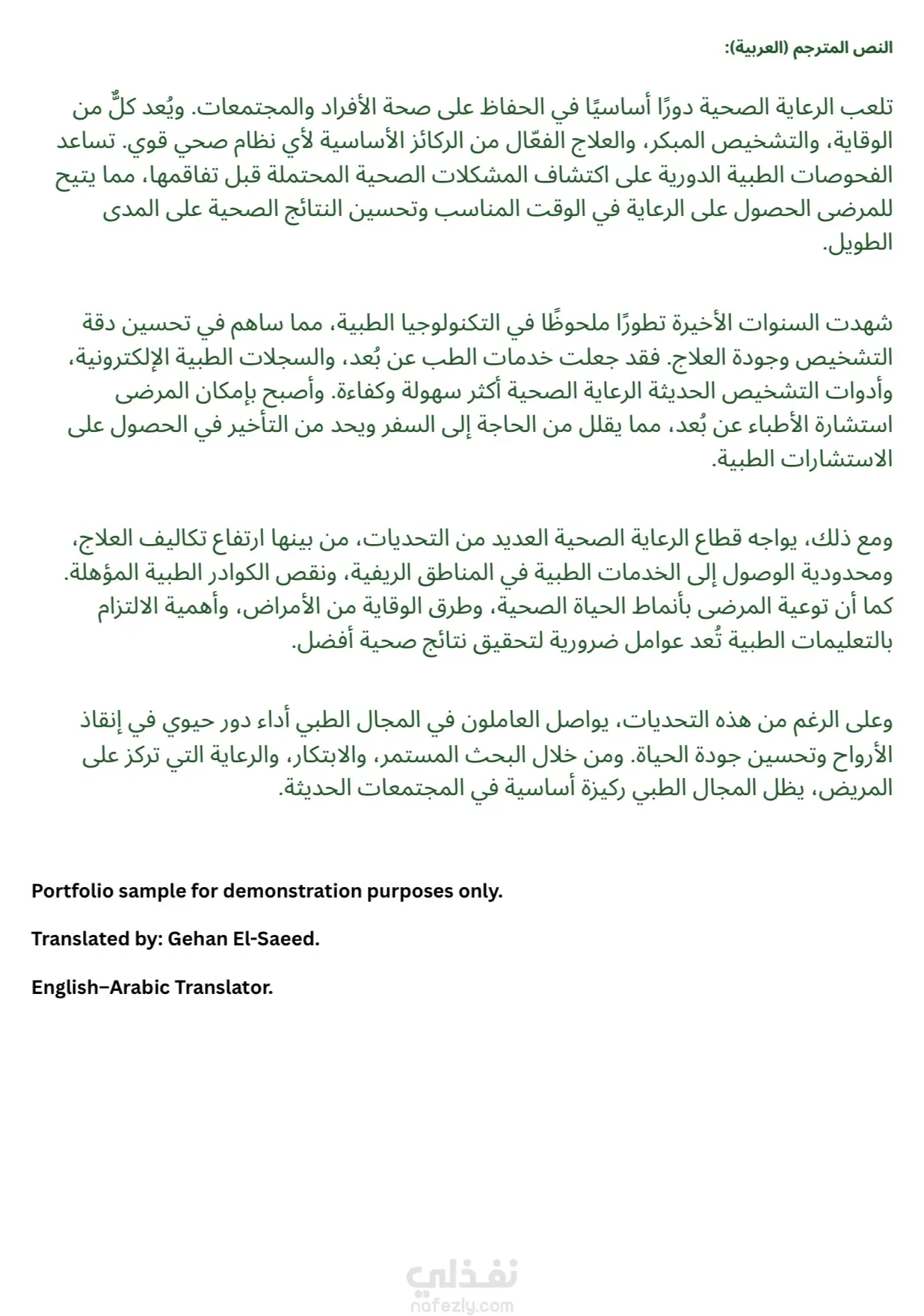 أقدّم خدمة ترجمة طبية دقيقة وموثوقة من اللغة الإنجليزية إلى اللغة العربية، مع الالتزام بالمصطلحات الطبية المعتمدة والأسلوب العلمي السليم، مع تبسيط المحتوى عند الحاجة ليكون مفهومًا للقارئ المستهدف دون الإخلال بالمعنى العلمي. أنواع المحتوى الذي أترجمه: مقالات ومحتوى طبي أبحاث ودراسات طبية تقارير طبية محتوى صحي توعوي وصفات ومنشورات طبية للسوشيال ميديا كتيبات وإرشادات طبية ما يميز الخدمة: دقة عالية في نقل المعنى والمصطلحات الطبية لغة عربية سليمة (فصحى واضحة أو مبسطة حسب الطلب) مراجعة لغوية كاملة قبل التسليم الالتزام بالسرية التامة للمحتوى تسليم في المواعيد المتفق عليها الهدف هو تقديم ترجمة طبية واضحة، دقيقة، ومناسبة للجمهور العربي سواء كان متخصصًا أو غير متخصص.