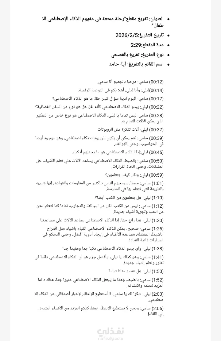 "تفريغ نصي احترافي (Transcription) مع التوقيت الزمني لتقرير تعليمي عن الذكاء الاصطناعي"