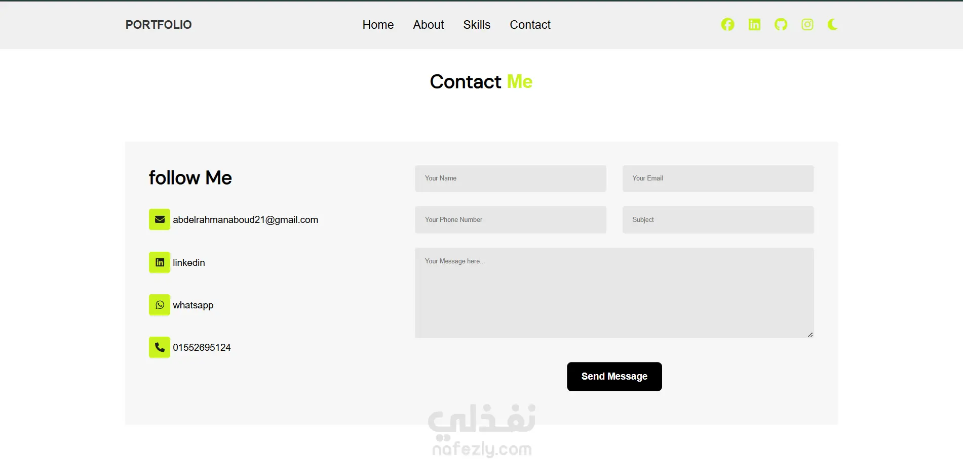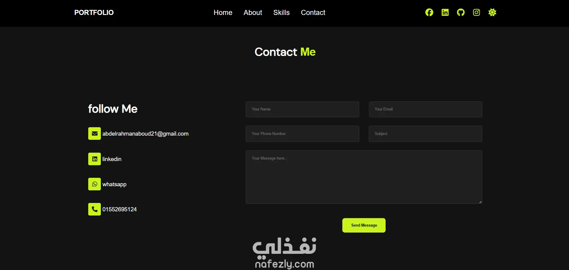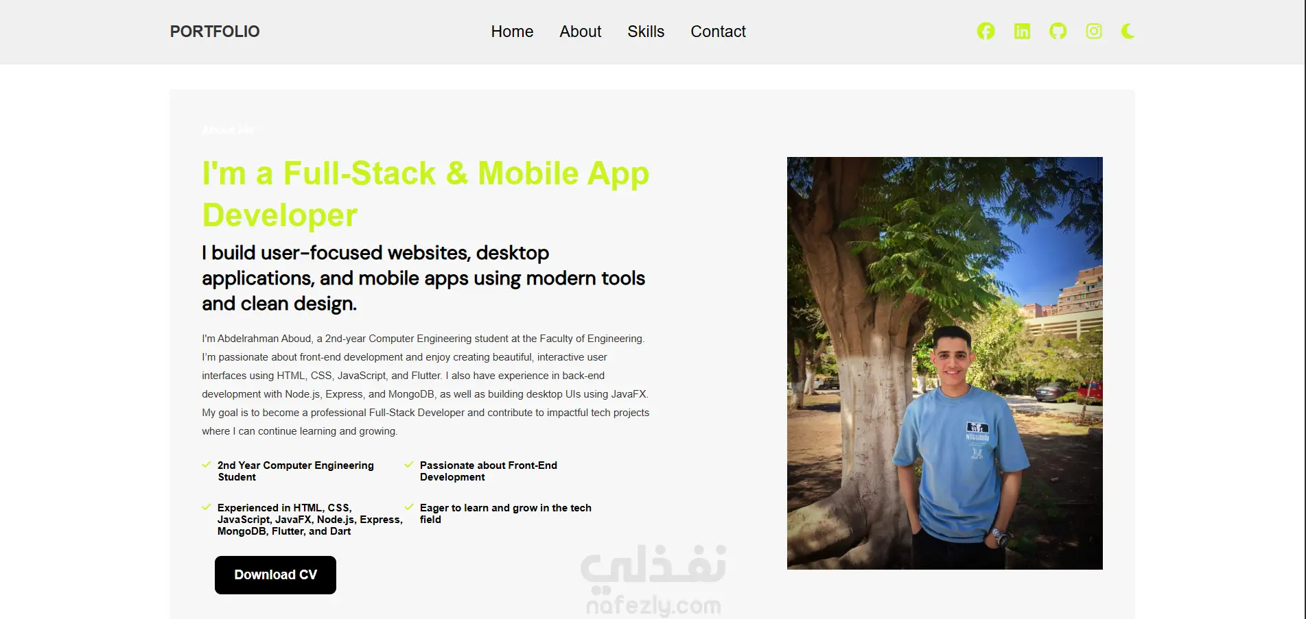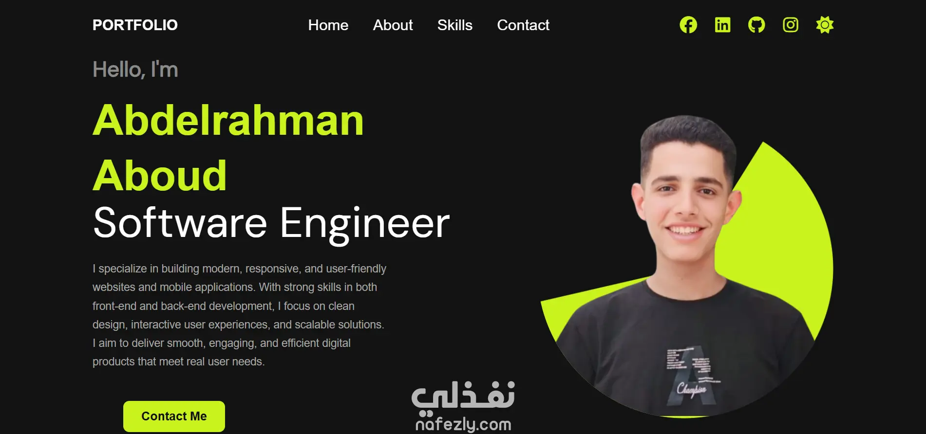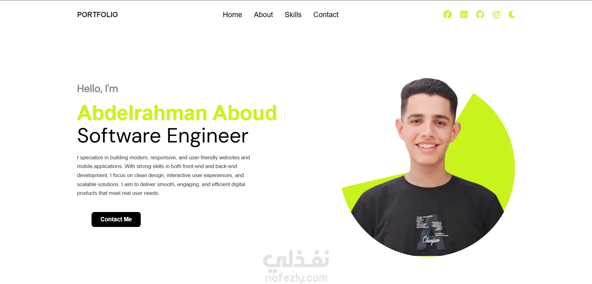قمت بتصميم وتطوير موقع "معرض أعمال" (Portfolio) متكامل يعكس هويتي كمهندس برمجيات، مع التركيز على تجربة المستخدم (UX) وجمالية التصميم (UI). الموقع مصمم ليكون سريعاً، متجاوباً مع جميع الشاشات، ويدعم ميزة التبديل بين الوضع الليلي والنهاري بسلاسة. أبرز المميزات التقنية: تصميم عصري ومتجاوب: الموقع يعمل بكفاءة عالية على الهواتف، الأجهزة اللوحية، وأجهزة الكمبيوتر. نظام الأنماط (Dark/Light Mode): تم تطبيق ميزة التبديل بين الأوضاع لتوفير راحة بصرية للمستخدم. أقسام الموقع: Hero Section: تعريف سريع وجذاب بالهوية المهنية. About Me: عرض الخبرات التعليمية والمهنية بشكل منظم. Skills Bar: عرض المهارات التقنية (HTML, CSS, JS, Flutter, Node.js...) باستخدام أشرطة تقدم (Progress Bars) تفاعلية. Contact Form: نموذج اتصاف متكامل لاستقبال الرسائل مباشرة. الأداء: كود نظيف (Clean Code) ومنظم لضمان سرعة التحميل وتحسين محركات البحث (SEO). التقنيات المستخدمة: Front-End: HTML5, CSS3, JavaScript. Design: UI/UX Principles, CSS Grid & Flexbox. Icons: FontAwesome / Boxicons.