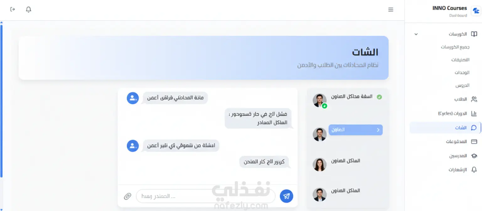تنفيذ لوحة تحكم مخصصة لإدارة منصة تعليمية، تم تصميمها لتسهيل متابعة وإدارة كل تفاصيل المنصة من مكان واحد وبأسلوب واضح ومنظم. تتضمن لوحة التحكم: نظام تنبيهات (Notifications) لعرض إشعارات مهمة مثل: إضافة كورسات جديدة اشتراك أو شراء الدورات تحديثات خاصة بالمحتوى أو المستخدمين نظام محادثة خاص يتيح التواصل المباشر بين المعلم والطالب داخل المنصة إدارة كاملة للمحتوى تشمل: إضافة وتعديل التصنيفات إدارة الكورسات والوحدات والدروس متابعة بيانات الطلاب: معلومات الطلاب المسجلين الدورات التي قاموا بشرائها حالة الاشتراك والتقدم داخل الكورسات تم التركيز على: تنظيم المعلومات بشكل واضح سهولة الاستخدام حتى لغير المتخصصين تسهيل العمل اليومي لفريق الإدارة والمعلمين