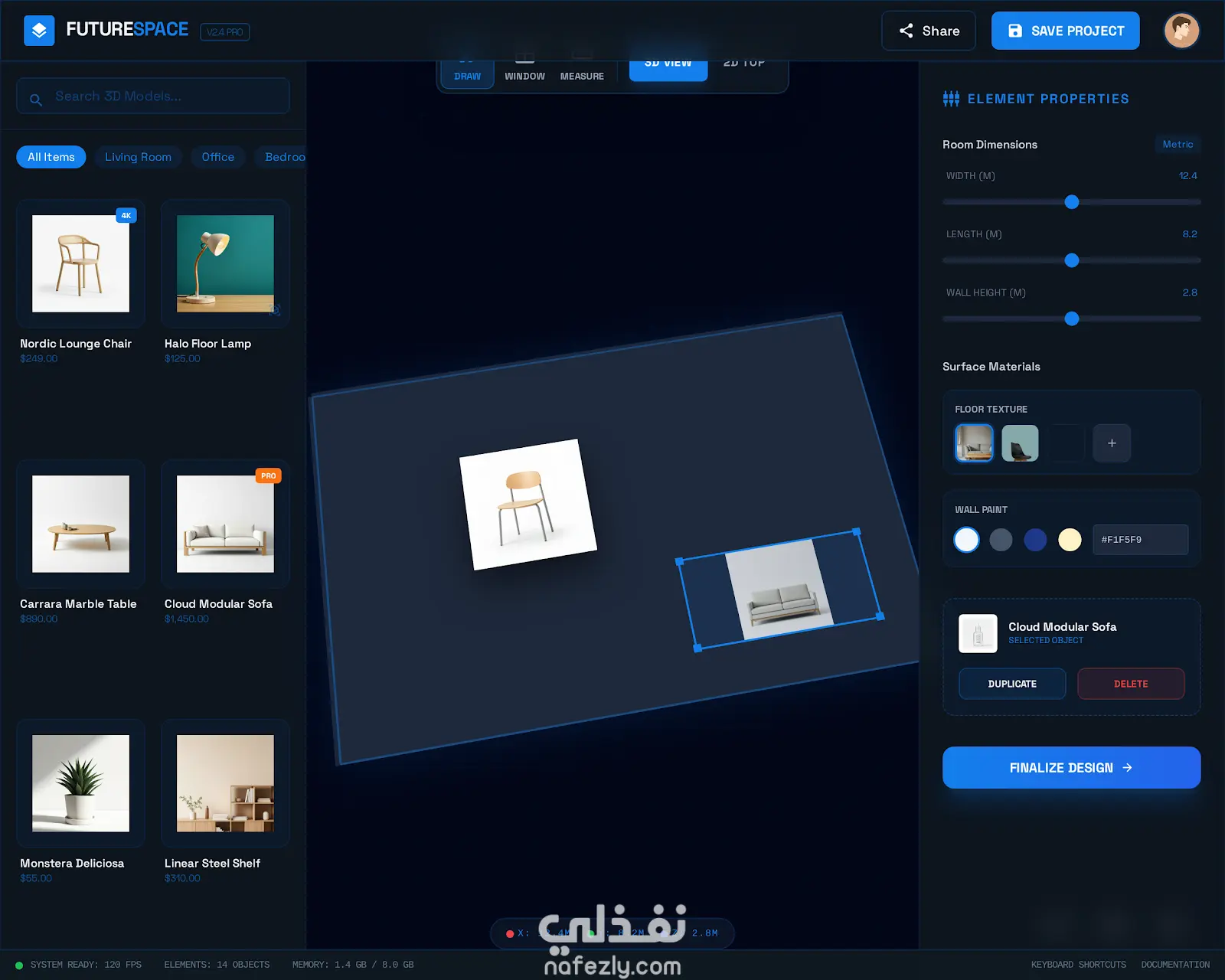 واجهة عمل متكاملة لتخطيط الغرف ثلاثية الأبعاد، تتميز بـ "كانفاس" (Canvas) واسع لتنسيق الأثاث، مع كتالوج منتجات يدعم السحب والإفلات، وأدوات احترافية لرسم الجدران وقياس الأبعاد؛ كل ذلك مغلف بسمة داكنة (Dark Theme) عصرية وعالية التقنية.