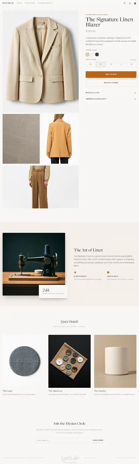 تصميم الصفحة الرئيسية لعلامتكم التجارية الفاخرة للأزياء المستدامة بجمالية قائمة على مفهوم "الفخامة الهادئة" (Quiet Luxury)