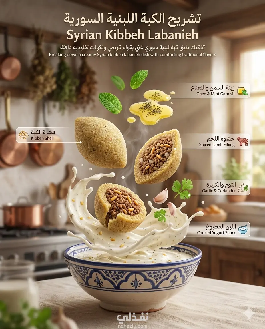 يتميز هذا التصميم بأسلوب بصري جذاب يجمع بين الرسم التوضيحي والمعلومات التقنية، وإليك أهم عناصره: المحتوى: يستعرض مكونات طبق "الشيش برك السوري" بطريقة تفاعلية. الأسلوب البصري: يستخدم تقنية التصوير بالحركة (Levitation Photography Style)، حيث تظهر المكونات وكأنها تطفو في الهواء فوق طبق اللبن. التصميم: يدمج بين النصوص العربية والإنجليزية مع أيقونات توضيحية لكل مكون (العجين، اللحم، اللبن، والتقلية).