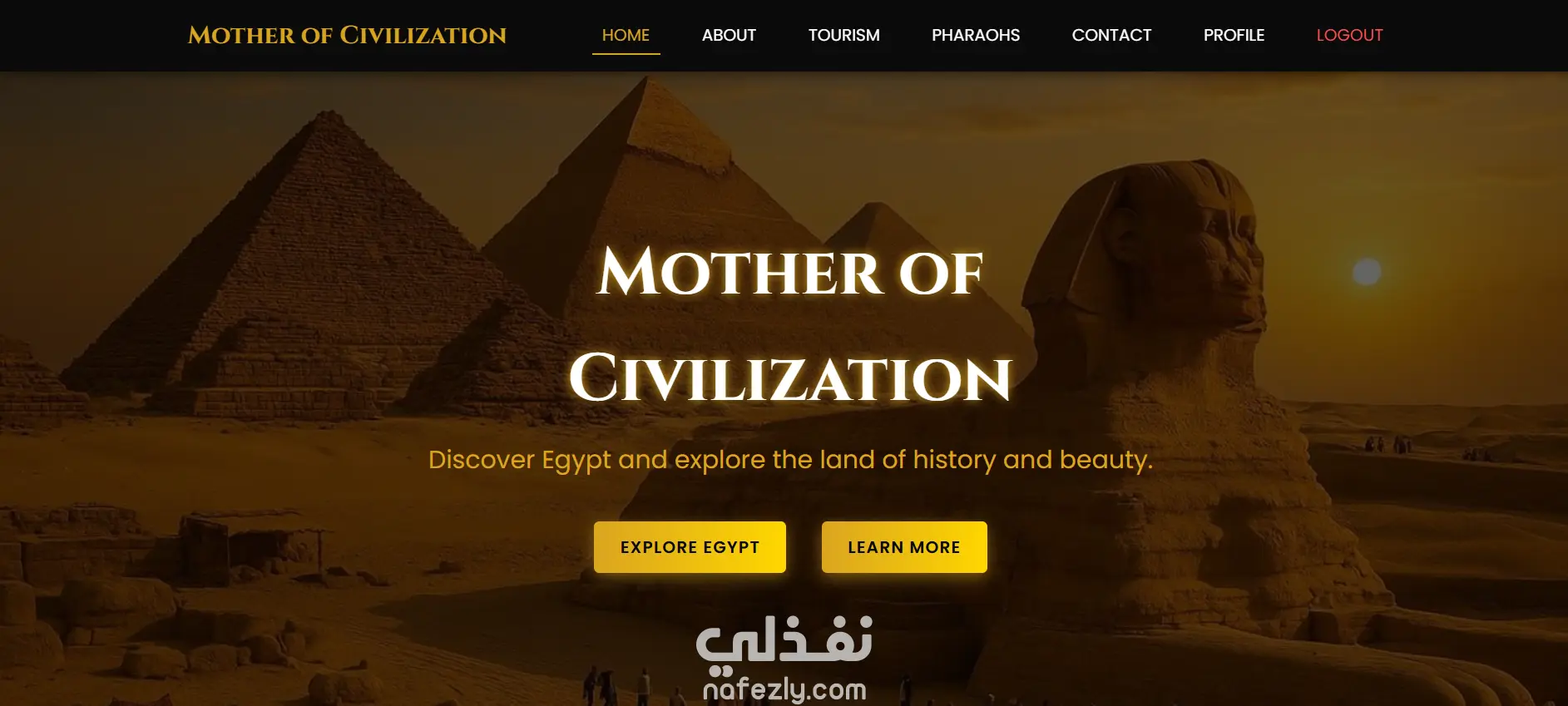 قمت بتصميم وتطوير موقع ويب احترافي بعنوان Mother of Civilization يهدف إلى إبراز عظمة الحضارة المصرية والترويج للسياحة بأسلوب عصري وجذاب.