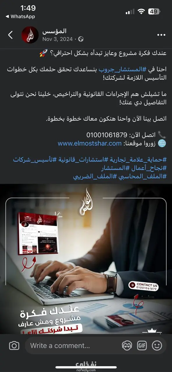 كتبت محتوى يعرّف بخدمات تأسيس الشركات بطريقة مبسطة تستهدف رواد الأعمال وأصحاب الأفكار الناشئة، مع التركيز على إزالة التعقيد القانوني وتحفيز التواصل مع الجهة. آلية التنفيذ: فهم طبيعة الخدمة القانونية تبسيط المصطلحات صياغة رسالة مباشرة تحفّز التواصل