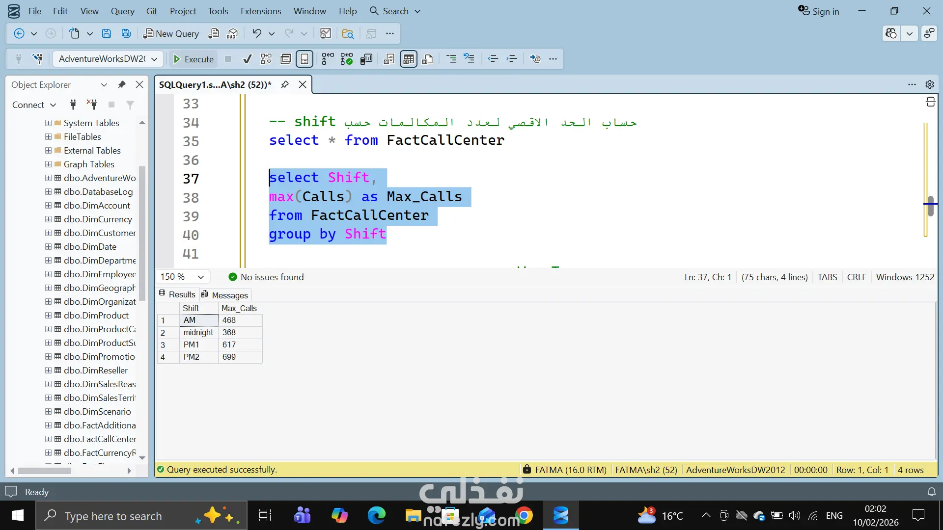 استعلام وتحليل البيانات: كتابة استعلامات SQL لاستخراج الحد الأقصى للمكالمات (Max Calls) لكل وردية عمل (Shift).