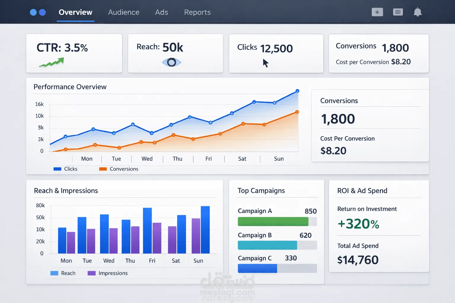 إدارة وتحليل حملة إعلانية ممولة بهدف زيادة التحويلات وتحقيق عائد استثمار مرتفع، مع متابعة الأداء وتحليل البيانات بشكل يومي لتحسين النتائج. تفاصيل الأداء (كما هو موضح في الصورة): CTR: 3.5% Reach: 50,000 Clicks: 12,500 Conversions: 1,800 Cost Per Conversion: $8.20 Total Ad Spend: $14,760 ROI: +320% ما تم تنفيذه خلال الحملة: تحديد هدف الحملة (Conversions) تحليل الجمهور المستهدف وتقسيمه إعداد الإعلانات والنصوص التسويقية متابعة الأداء وتحسين النتائج تحليل البيانات واتخاذ قرارات مبنية على الأرقام الأدوات المستخدمة: Meta Ads Manager أدوات تحليل الأداء الإعلاني Canva (لتصميم الإعلانات)