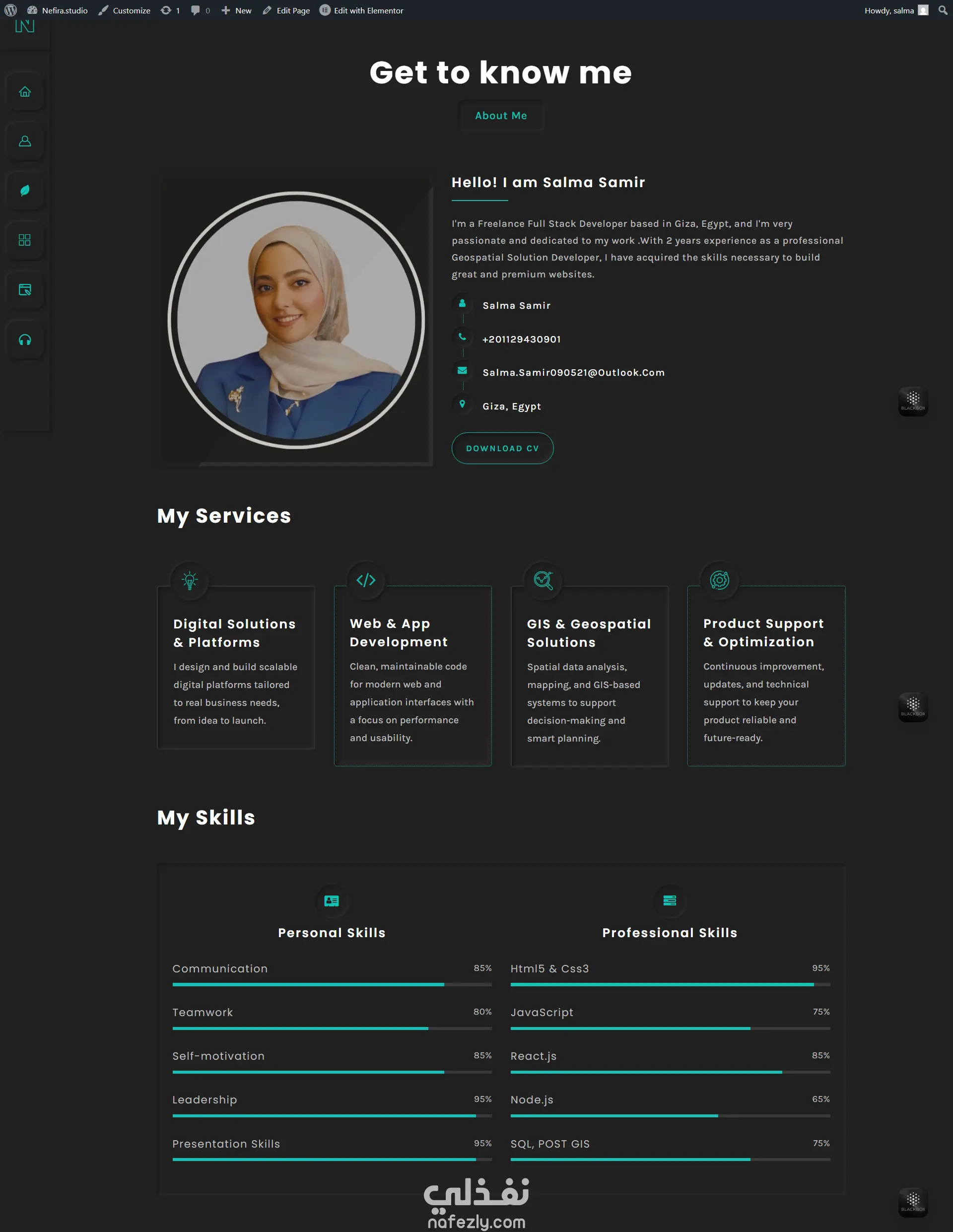 قمت بتصميم وتطوير موقع شخصي Portfolio Website لعرض خبراتي ومهاراتي كمطورة حلول جغرافية (Geospatial Solutions Developer) بشكل احترافي وحديث. الموقع يهدف إلى تقديم نبذة واضحة عني، وعرض المشاريع التقنية التي عملت عليها، بالإضافة إلى تسهيل التواصل مع العملاء والشركات. ? أهم المميزات: تصميم عصري ومتجاوب مع جميع الشاشات (Responsive Design) صفحة تعريفية عني (About Me) قسم لعرض المشاريع والأعمال السابقة (Projects Showcase) عرض المهارات التقنية والشهادات بشكل منظم صفحة تواصل مباشرة (Contact Section) تجربة مستخدم بسيطة وسلسة ? التقنيات المستخدمة: WordPress - elementor - Canva هذا المشروع يمثل نموذجًا لعملي في تصميم واجهات المستخدم وبناء مواقع شخصية احترافية تناسب سوق العمل والشركات التقنية.