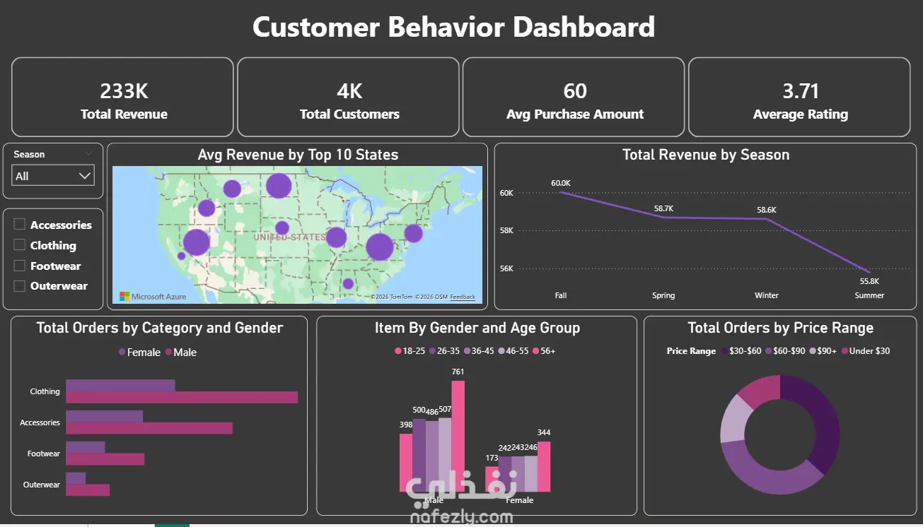 قمت بتصميم وتنفيذ لوحة معلومات تفاعلية لتحليل سلوك العملاء والمبيعات بهدف دعم اتخاذ القرار وتحسين استراتيجيات التسويق والمبيعات. أهداف المشروع: تحليل إجمالي الإيرادات وعدد العملاء فهم أنماط الشراء حسب الموسم تحليل الفروقات بين الفئات العمرية والنوع دراسة توزيع الطلبات حسب الفئات السعرية تحديد أكثر الولايات تحقيقًا للإيرادات الأدوات المستخدمة: Power BI تحليل البيانات وData Modeling إنشاء KPIs ومؤشرات أداء رئيسية تصميم Dashboard احترافية وتفاعلية أهم المؤشرات المعروضة: إجمالي الإيرادات: 233K عدد العملاء: 4K متوسط قيمة الشراء: 60 متوسط التقييم: 3.71 التحليلات المتضمنة: تحليل الإيرادات حسب الموسم (Seasonality Analysis) متوسط الإيرادات في أعلى 10 ولايات تحليل الطلبات حسب الفئة والنوع (Category & Gender Analysis) توزيع الطلبات حسب الفئة السعرية تحليل الأعمار وتأثيرها على سلوك الشراء القيمة المقدمة: تحديد الفئات الأكثر إنفاقًا معرفة المواسم الأعلى مبيعًا دعم قرارات التسعير تحسين استهداف الحملات التسويقية