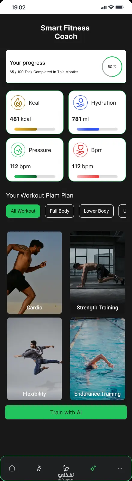 يركز التصميم على واجهة داكنة حديثة مع لون أخضر نابض بالحياة يعكس الطاقة والنمو والصحة، مع تجربة استخدام سهلة وواضحة تُحفّز المستخدم على الاستمرار وتحقيق أهدافه. تم بناء التدفق (User Flow) بشكل مدروس يبدأ من مرحلة التعريف بالمستخدم (Onboarding) مرورًا بلوحة التحكم الذكية، وحتى التفاعل مع المدرب الذكي وخطط التغذية والتمارين.