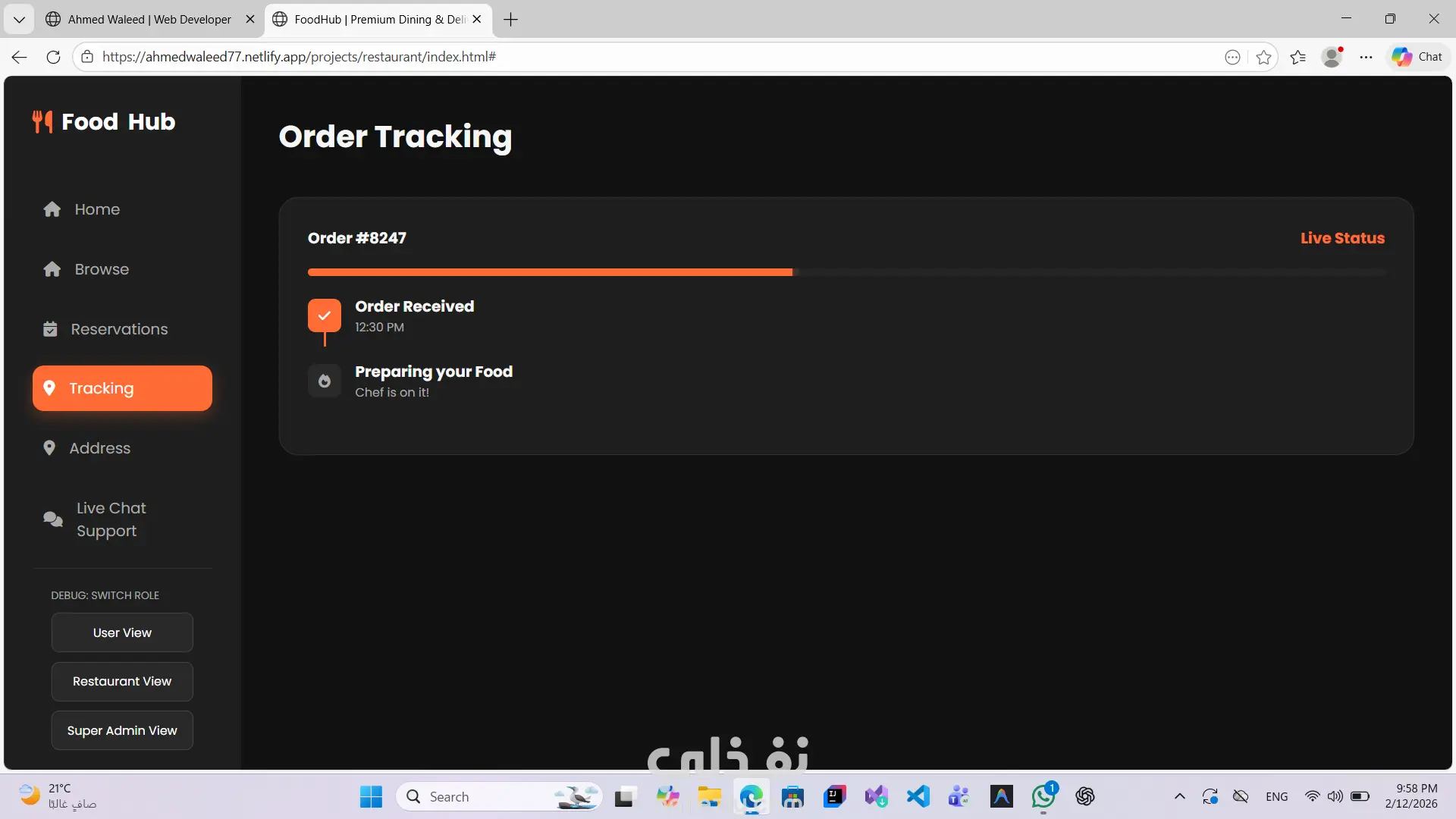 تتبع حالة الطلب (Pending – Preparing – Out for Delivery – Delivered)